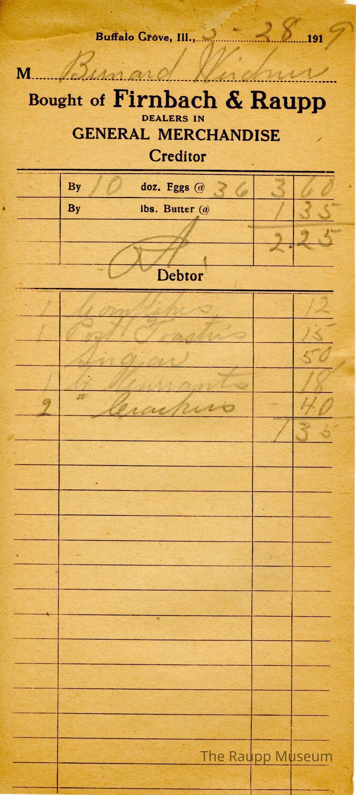 The black printed text is as follows, from top to bottom: Buffalo Gove. Ill, 191; Bought of Firnbach & Raupp; Dealers in GENERAL MERCHANDISE; Creditor; DebtorArchive Details