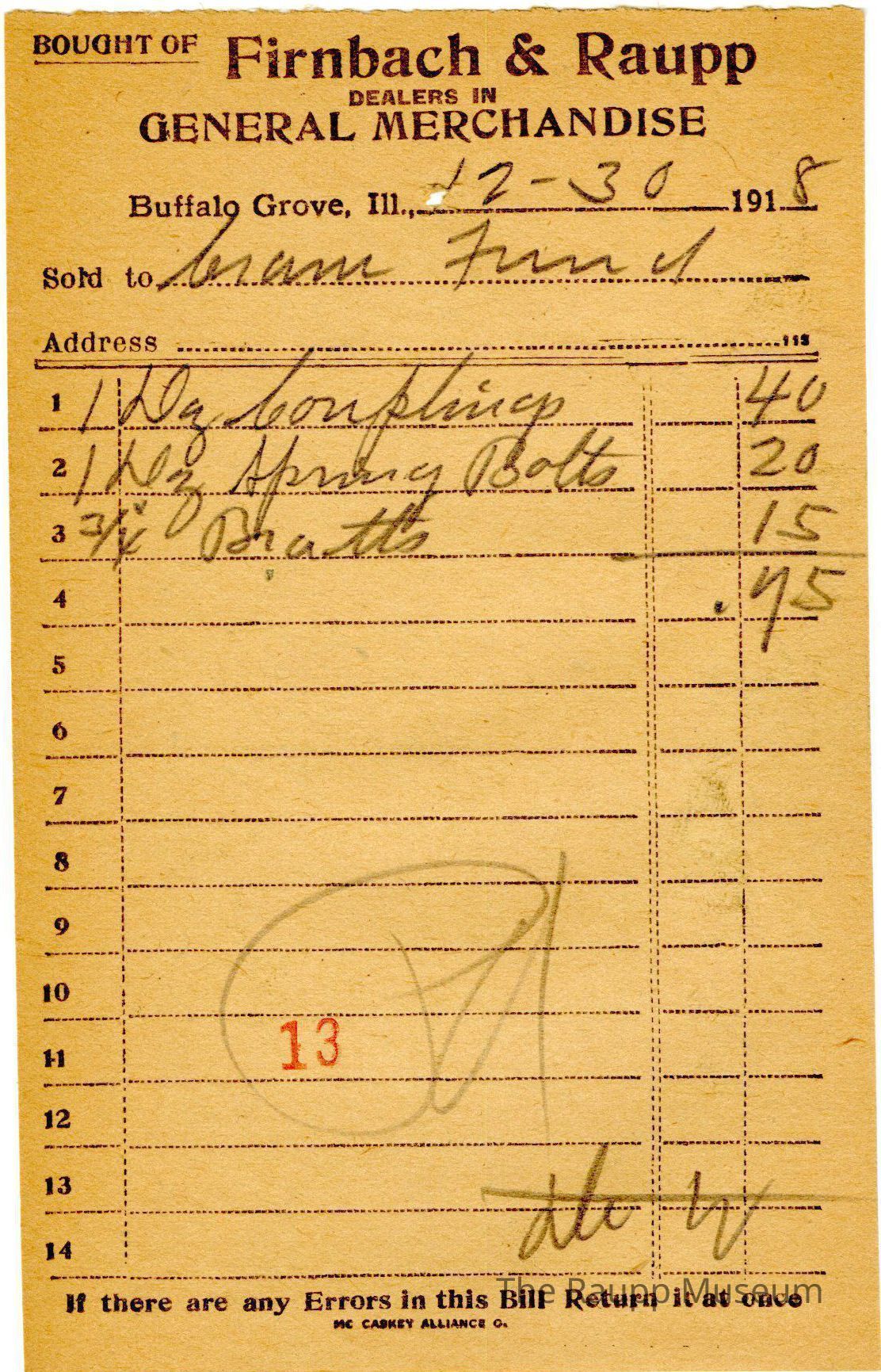 One (1) Firnbach and Raupp store receipt from December 30, 1918. Receipt is rectangular with black printed text and written notes in pencil. The receipt is for Crane Funnel(?), who bought one dz (dozen) couplings for $0.40, one dz (dozen) spring bolts for $0.20, and 3/4 " (continuation of dozen) Bratts(?) for $0.15. The bill total is $0.75.