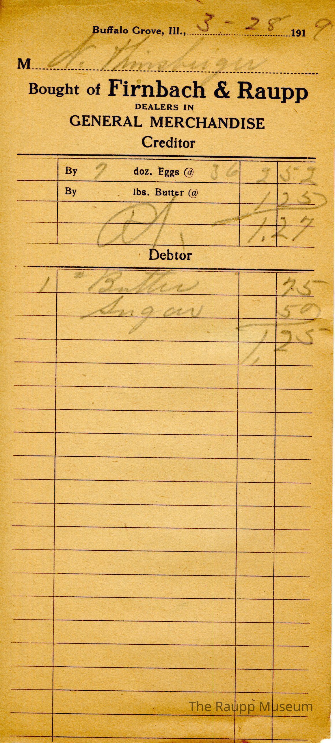 The black printed text is as follows, from top to bottom: Buffalo Gove. Ill, 191; Bought of Firnbach & Raupp; Dealers in GENERAL MERCHANDISE; Creditor; DebtorArchive Details