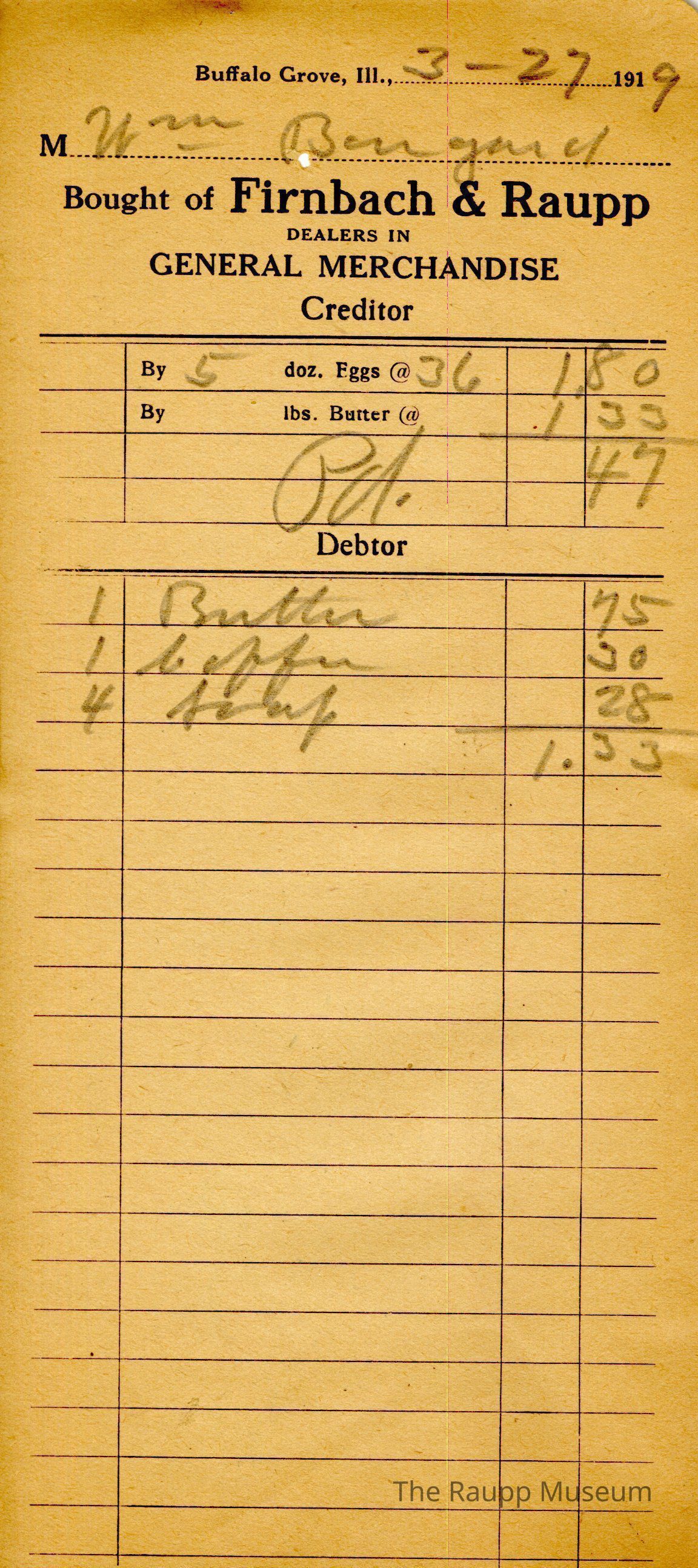 The black printed text is as follows, from top to bottom: Buffalo Gove. Ill, 191; Bought of Firnbach & Raupp; Dealers in GENERAL MERCHANDISE; Creditor; DebtorArchive Details