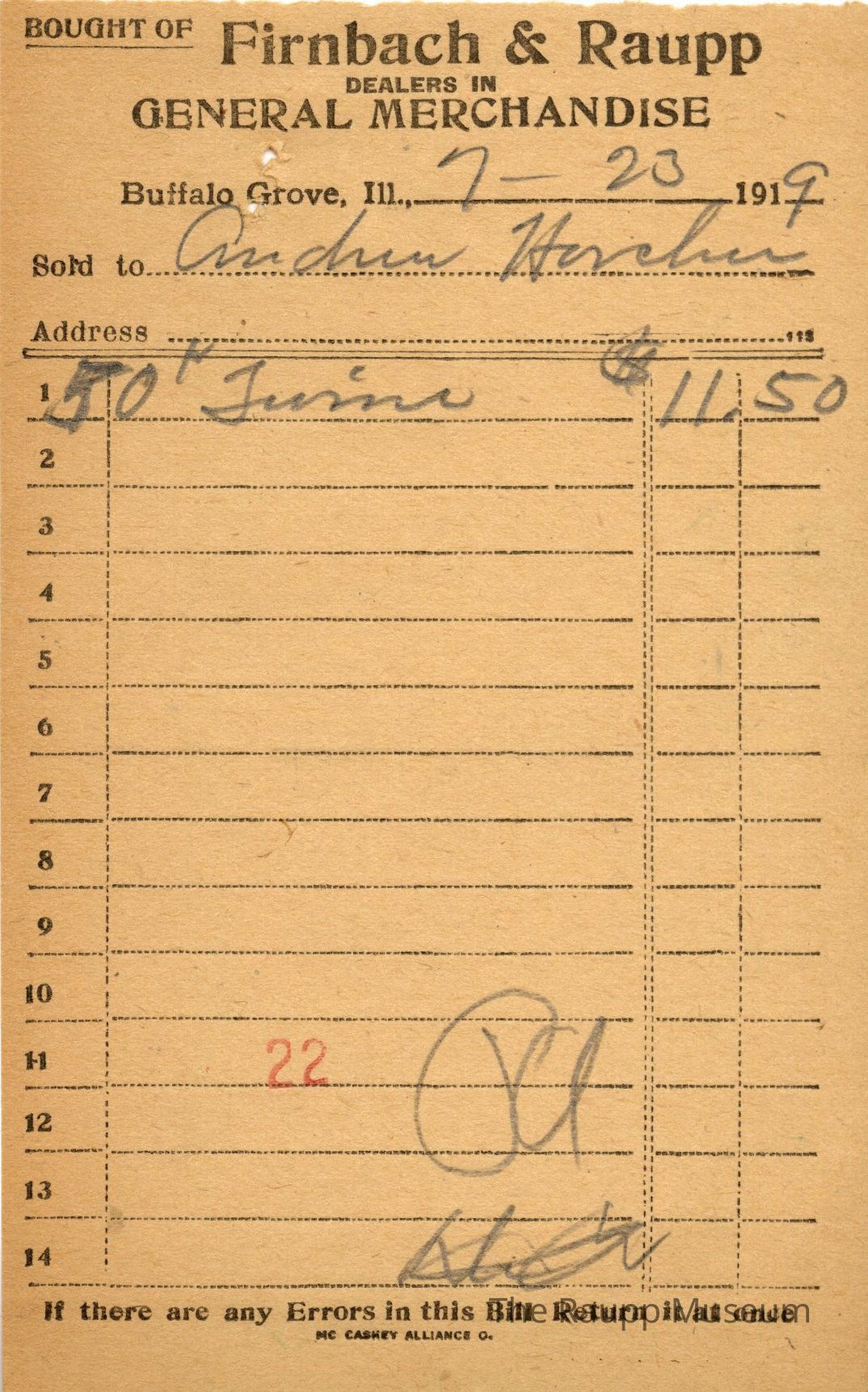 One (1) Firnbach and Raupp store receipt from July 23 1919. Receipt is for Andrew Horcher, and has one (1) item purchased. Purchased item is fifty (50) # twine. Total is $11.50. Receipt is rectangular, with both printed and handwritten text. On the top is printed "Firnbach & Raupp Dealers In General Merchandise." PD is handwritten on the bottom, and a red 22 is stamped on the center bottom.Archive Details