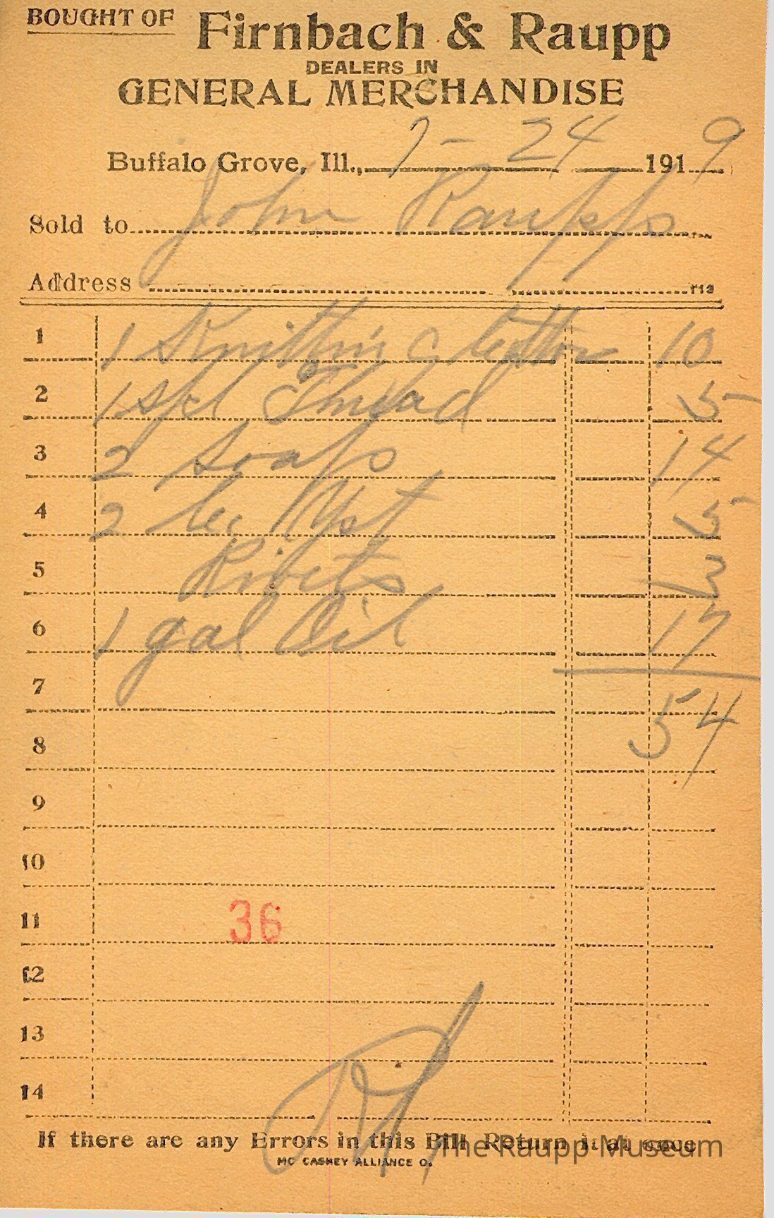 The black text is as follows, from top to bottom: Bought of Firnbach & Raupp; DEALERS IN; GENERAL MERCHANDISE; Buffalo Grove, Ill; Sold to; Address; If there are any Errors in this Bill, Return it at once; Mc Caskey Alliance CoArchive Details
