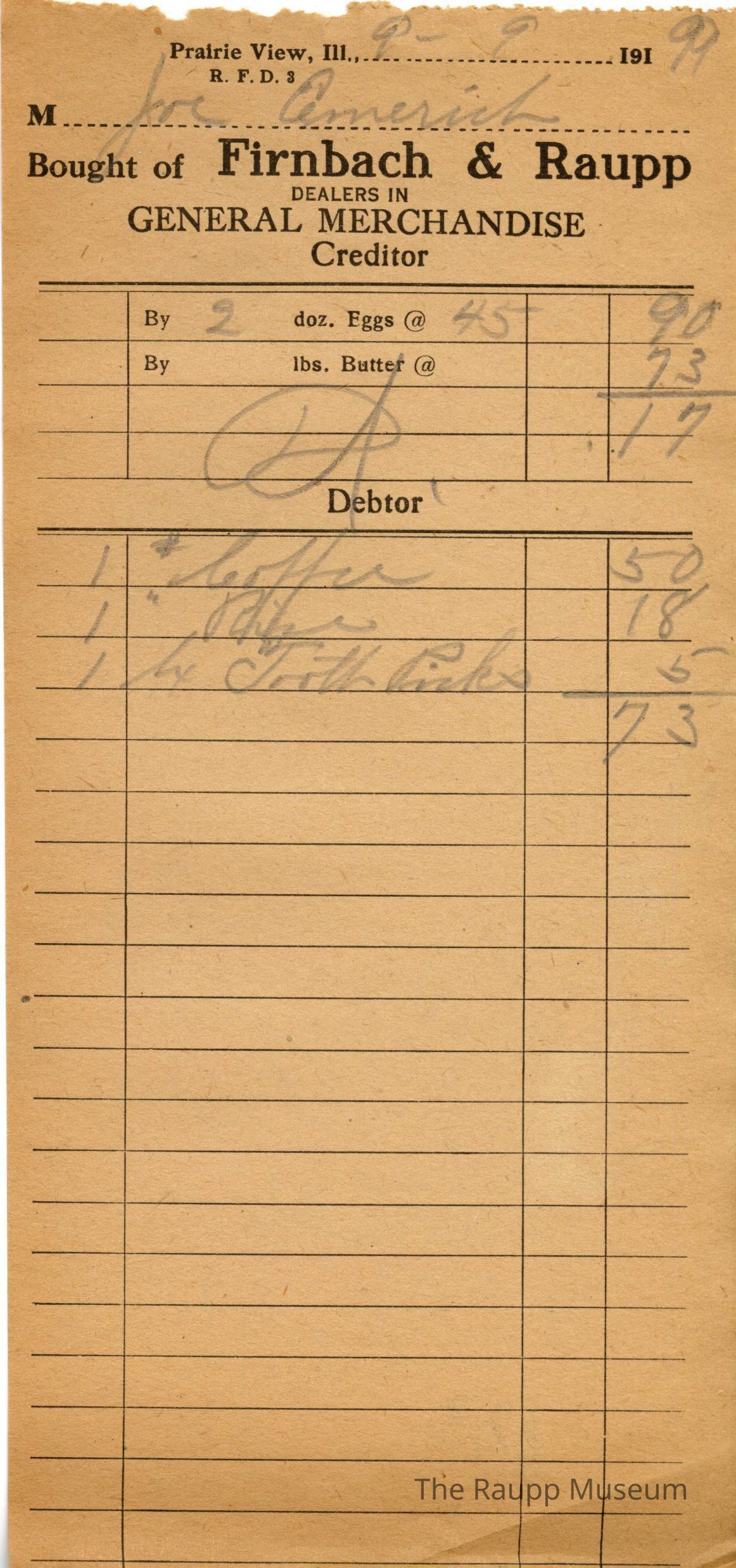 One (1) Firnbach and Raupp store receipt from September 9 1919. Receipt is for Joe Emmerich, and has three (3) items purchased, as well as two (2) dozen eggs sold as credit for $.45 per dozen totals $.90. Purchased items include one (1) # coffee, one (1) (?), and one (1) dozen tooth picks. Total is $.73, and $.17 after credit. Receipt is rectangular, with both printed and handwritten text. On the top is printed "Firnbach & Raupp Dealers In General Merchandise." PD is handwritten on the center top.Archive Details
