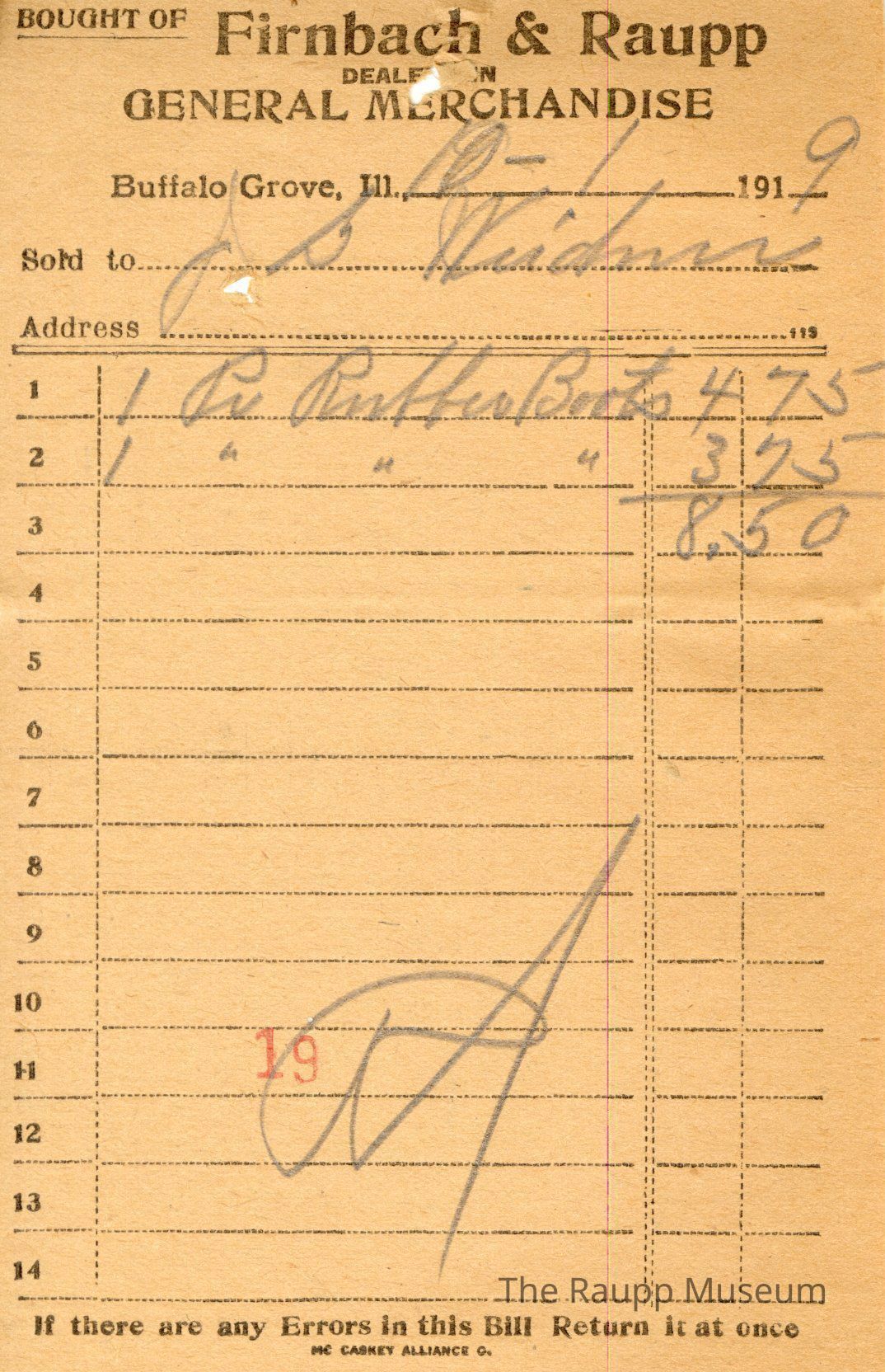 One (1) Firnbach and Raupp store receipt from October 1, 1919. Receipt is rectangular with black printed text and written notes in pencil. The receipt is for J.G. Weidner, who bought one pair of Ruffeo (?) boots for $4.75 and bought another pair of Ruffeo (?) boots for $3.75. The bill total is $8.50 and the receipt is marked as paid. A red stamp of 19 is located towards the bottom of the page. The text from top to bottom is: BOUGHT OF Firnbach & Raupp; DEALERS IN GENERAL MERCHANDISE; Buffalo Grove, Ill.; Sold to; Address; If there are any Errors in this Bill Return It at once; MC CASKEY ALLIANCE O.Archive Details