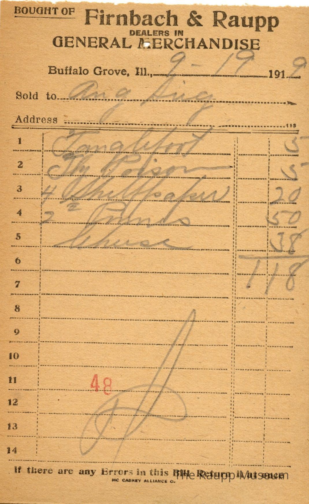 One (1) Firnbach and Raupp store receipt from September 19 1919. Receipt is for Ang Sieg, and has five (5) items purchased. Purchased items include one (1) tanglefoot, one fly poison, four (4) shelfpaper (?), two (2) # prunes, and one (1) cheese. Total was $1.18. Receipt is rectangular, with both printed and handwritten text. On the top is printed "Firnbach & Raupp Dealers In General Merchandise." PD is handwritten on the bottom, and a red number 48 is stamped on the center bottom.Archive Details