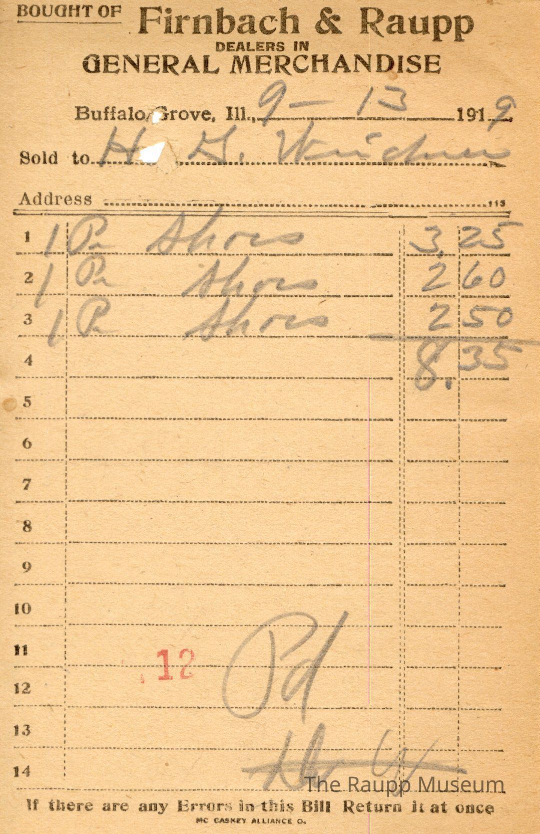 One (1) Firnbach and Raupp store receipt from September 13, 1919. Receipt is rectangular with black printed text and written notes in pencil. The receipt is for H.G. Weidner, who bought one pair of shoes for $3.25, another pair of shoes for $2.60, and a third pair of shoes for $2.50. The bill total is $8.35 and the receipt is marked as paid. A red stamp of 12 is located towards the bottom of the page. The text from top to bottom is: BOUGHT OF Firnbach & Raupp; DEALERS IN GENERAL MERCHANDISE; Buffalo Grove, Ill.; Sold to; Address; If there are any Errors in this Bill Return It at once; MC CASKEY ALLIANCE O.Archive Details