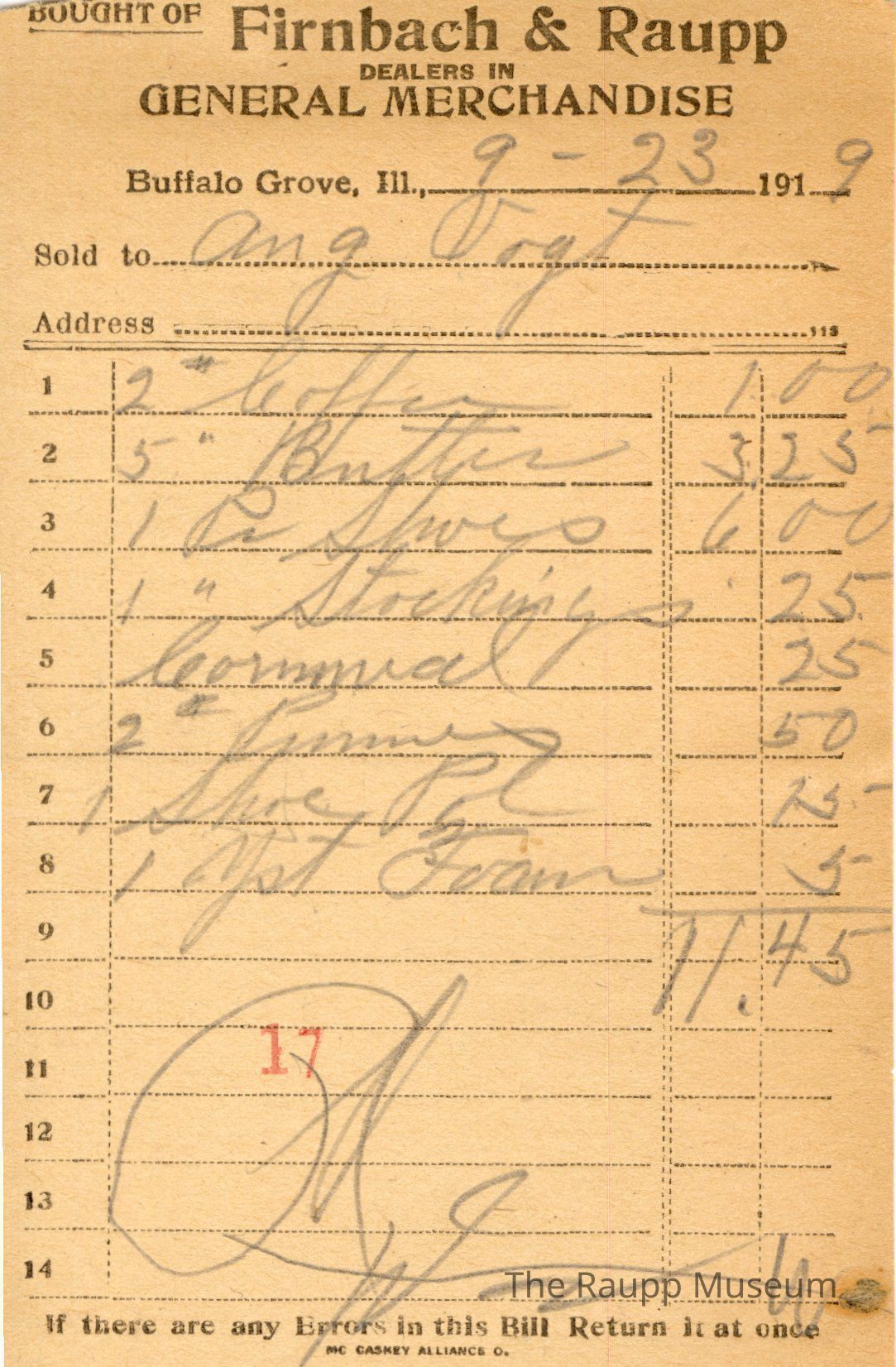 One (1) Firnbach and Raupp store receipt from September 23, 1919. Receipt is rectangular with black printed text and written notes in pencil. The receipt is for Aug Vogt, who bought two pounds of coffee for $1.00, five pounds of butter for $3.25, one pair of shoes for $6.00, one pair of stockings for $0.25, cornmeal for $0.25, two ponds of prunes for $0.50, one shoe polish for $0.15, and one yeast foam for $0.05. The bill total is $11.45 and the receipt is marked as paid. A red stamp of 17 is located towards the bottom of the page. The text from top to bottom is: BOUGHT OF Firnbach & Raupp; DEALERS IN GENERAL MERCHANDISE; Buffalo Grove, Ill.; Sold to; Address; If there are any Errors in this Bill Return It at once; MC CASKEY ALLIANCE O.Archive Details