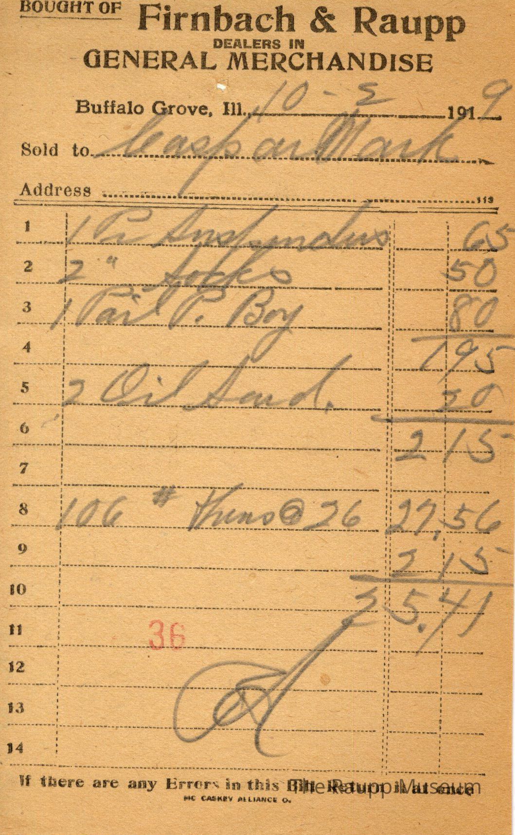 One (1) Firnbach and Raupp store receipt from October 2, 1919. Receipt is rectangular with black printed text and written notes in pencil. The receipt is for Gaspan Mark (?), who bought one pair of suspanders (?) for $0.65, two pairs of socks for $0.50, one Pail P. Boy for $0.80, and two oil sand for $0.20 for a total of $2.15. Mark also seemed to traded in 106 pounds of thens (?) at $0.26 per pound for $27.56. The bill total is $25.41 (for the customer) and the receipt is marked as paid. A red stamp of 36 is located towards the bottom of the page. The text from top to bottom is: BOUGHT OF Firnbach & Raupp; DEALERS IN GENERAL MERCHANDISE; Buffalo Grove, Ill.; Sold to; Address; If there are any Errors in this Bill Return It at once; MC CASKEY ALLIANCE O.Archive Details