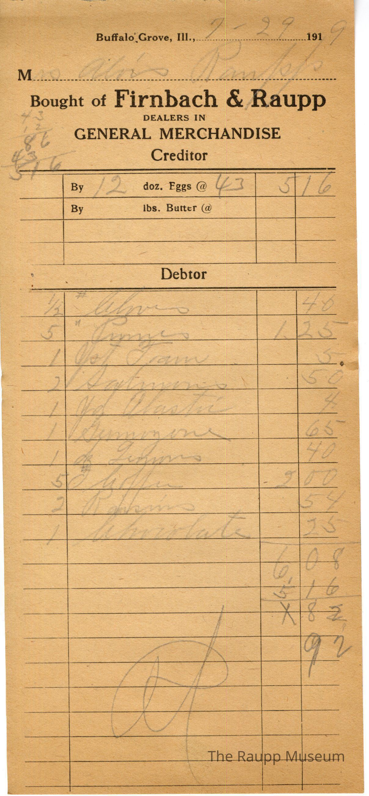 One (1) Firnbach and Raupp store receipt from July 29, 1919. Receipt is rectangular with black printed text and written notes in pencil. The receipt is for Mrs Alois Raupp, who sold 12 dozen eggs at $0.43 for a total of $5.16. She bought 1.2 # cloves for $0.40, 2# prunes for $1.25, 1 yst foam for $0.05, 2 salmon(?) for $0.50, 1 yd elastic for $0.04, 1(?) for $0.65, 1 dz. lemons for $0.40, 5# coffee for $2.00, 2 raisins for $0.54 and 1 chocolate for $0.25. Spending total was $6.08. After the money earned from eggs was subtracted, the bill total was $0.92. The bill is marked as paid. There is multiplication and addition at the top of the receipt.
