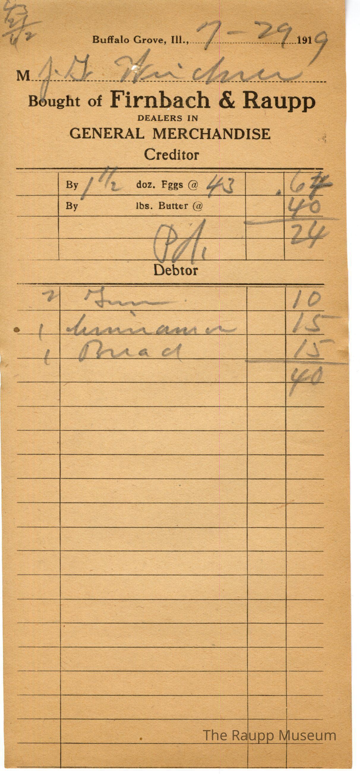 The black text is as follows, from top to bottom: Buffalo Grove, Ill.,; M; Bought of Firnbach & Raupp; DEALERS IN; GENERAL MERCHANDISE; Creditor; By doz. Eggs @; By lbs. Butter @; DebtorArchive Details