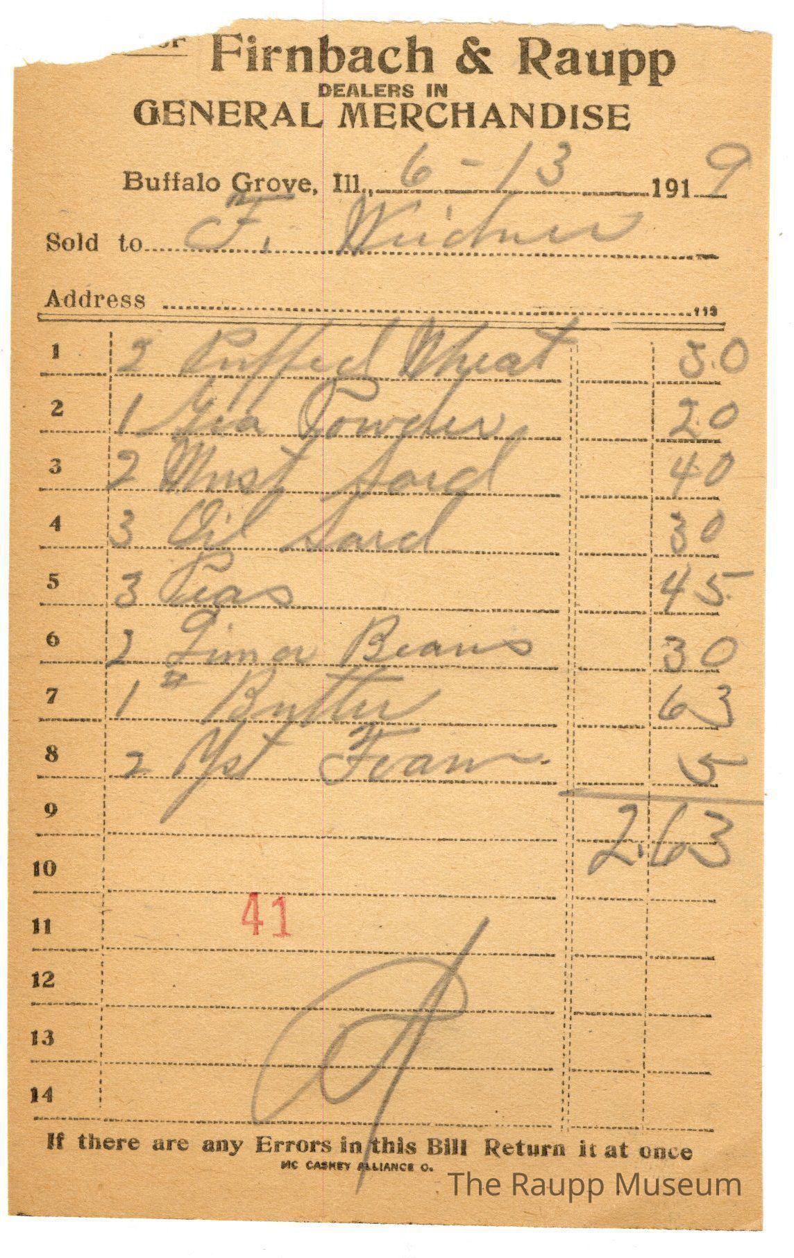 One (1) Firnbach and Raupp store receipt from June 13, 1919. Receipt is rectangular with black printed text and written notes in pencil. The receipt is for F. Weidner, who bought two Puffed Wheat for $0.30, one Gra Powder for $0.20, two must (mustard) seed for $0.40, three oil sard (sardines) for $0.30, three peas for $0.45, two lima beans for $0.30, one # (pound) butter for $0.63, and two yst (yeast) foam for $0.05. Bill total is $2.63. There's a red stamp of 41 close to the bottom, with the bill marked as paid (written as "Pd.").