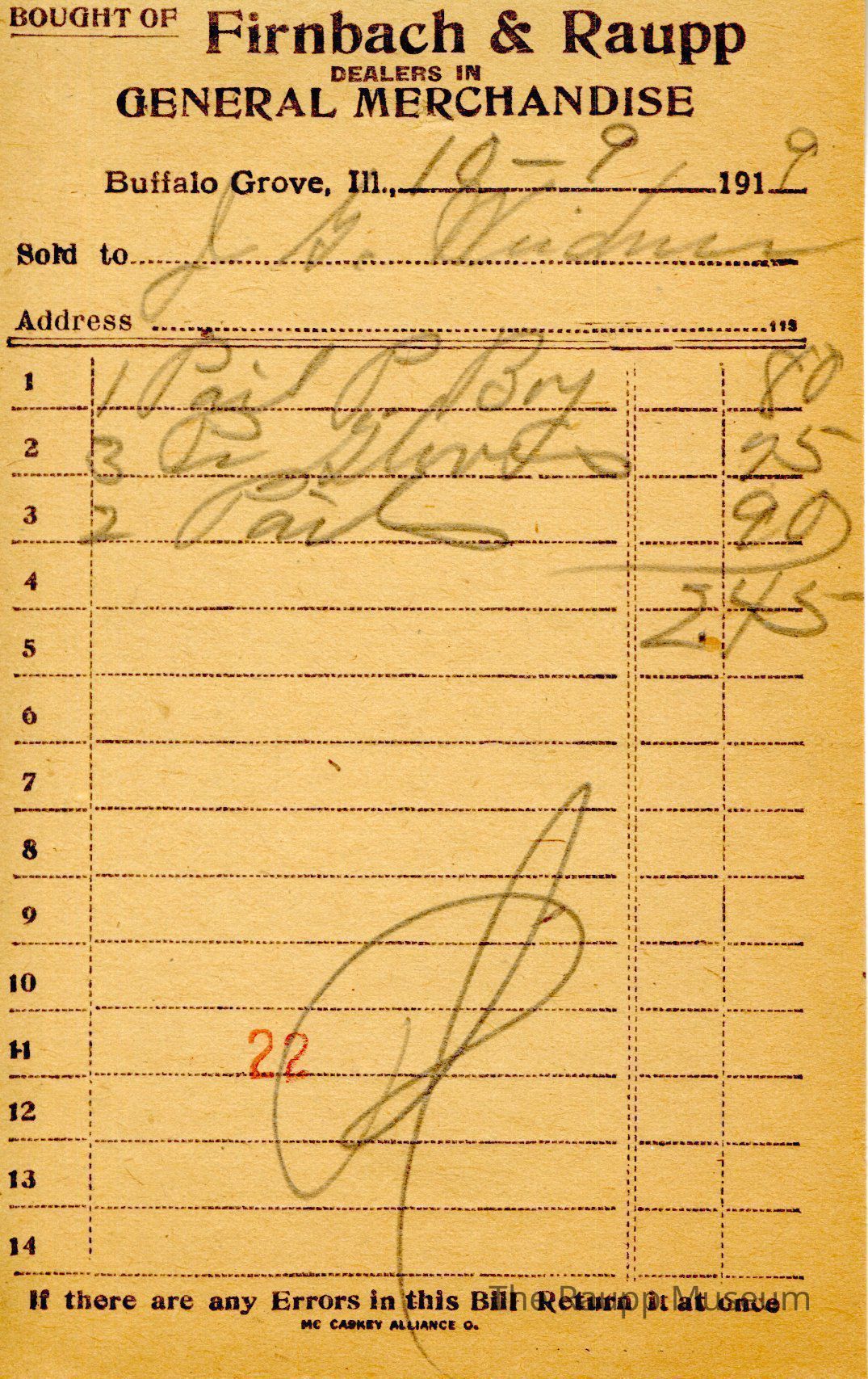 One (1) Firnbach and Raupp store receipt from October 9, 1919. Receipt is rectangular with black printed text and written notes in pencil. The receipt is for J. G. Weidner, who bought one Pail P. Boy for $0.80, three pairs of gloves for $0.75, and two pails for $0.90. The bill total is $2.45 and the receipt is marked as paid. A red stamp of 22 is located towards the bottom of the page. The text from top to bottom is: BOUGHT OF Firnbach & Raupp; DEALERS IN GENERAL MERCHANDISE; Buffalo Grove, Ill.; Sold to; Address; If there are any Errors in this Bill Return It at once; MC CASKEY ALLIANCE O.Archive Details