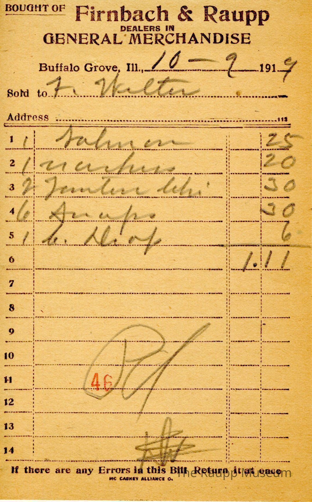 One (1) Firnbach and Raupp store receipt from October 9, 1919. Receipt is rectangular with black printed text and written notes in pencil. The receipt is for F. Welter, who bought one salmon for $0.25, one crackers for $0.20, two jemtere lihi (?) for $0.30, six soaps for $0.30, and one b. lhop (?) for $0.06. The bill total is $1.11 and the receipt is marked as paid. A red stamp of 46 is located towards the bottom of the page. The text from top to bottom is: BOUGHT OF Firnbach & Raupp; DEALERS IN GENERAL MERCHANDISE; Buffalo Grove, Ill.; Sold to; Address; If there are any Errors in this Bill Return It at once; MC CASKEY ALLIANCE O.Archive Details