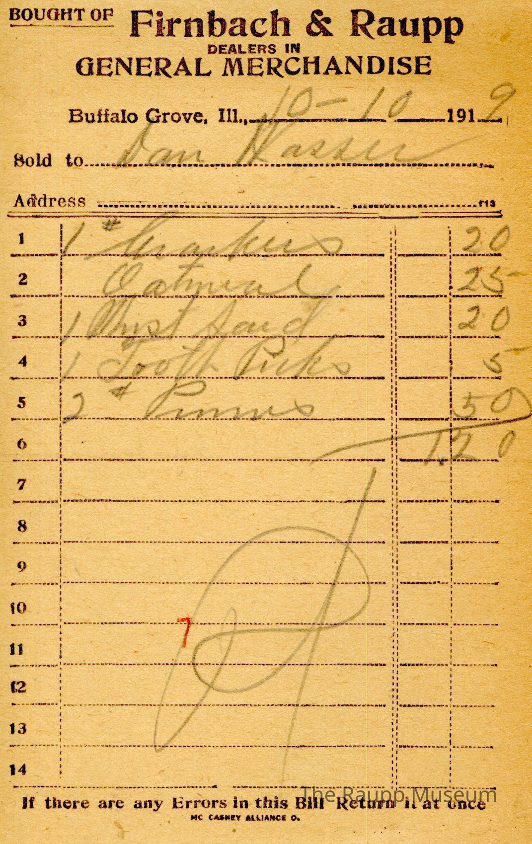 One (1) Firnbach and Raupp store receipt from October 10, 1919. Receipt is rectangular with black printed text and written notes in pencil. The receipt is for Dan Wasser, who bought one pound of cookies for $0.20, oatmeal for $0.25, one Must Sard (?) for $0.20, one toothpicks for $0.05, and two pounds of prunes for $0.50. The bill total is $1.20 and the receipt is marked as paid. A red stamp of 7 is located towards the bottom of the page. The text from top to bottom is: BOUGHT OF Firnbach & Raupp; DEALERS IN GENERAL MERCHANDISE; Buffalo Grove, Ill.; Sold to; Address; If there are any Errors in this Bill Return It at once; MC CASKEY ALLIANCE O.Archive Details