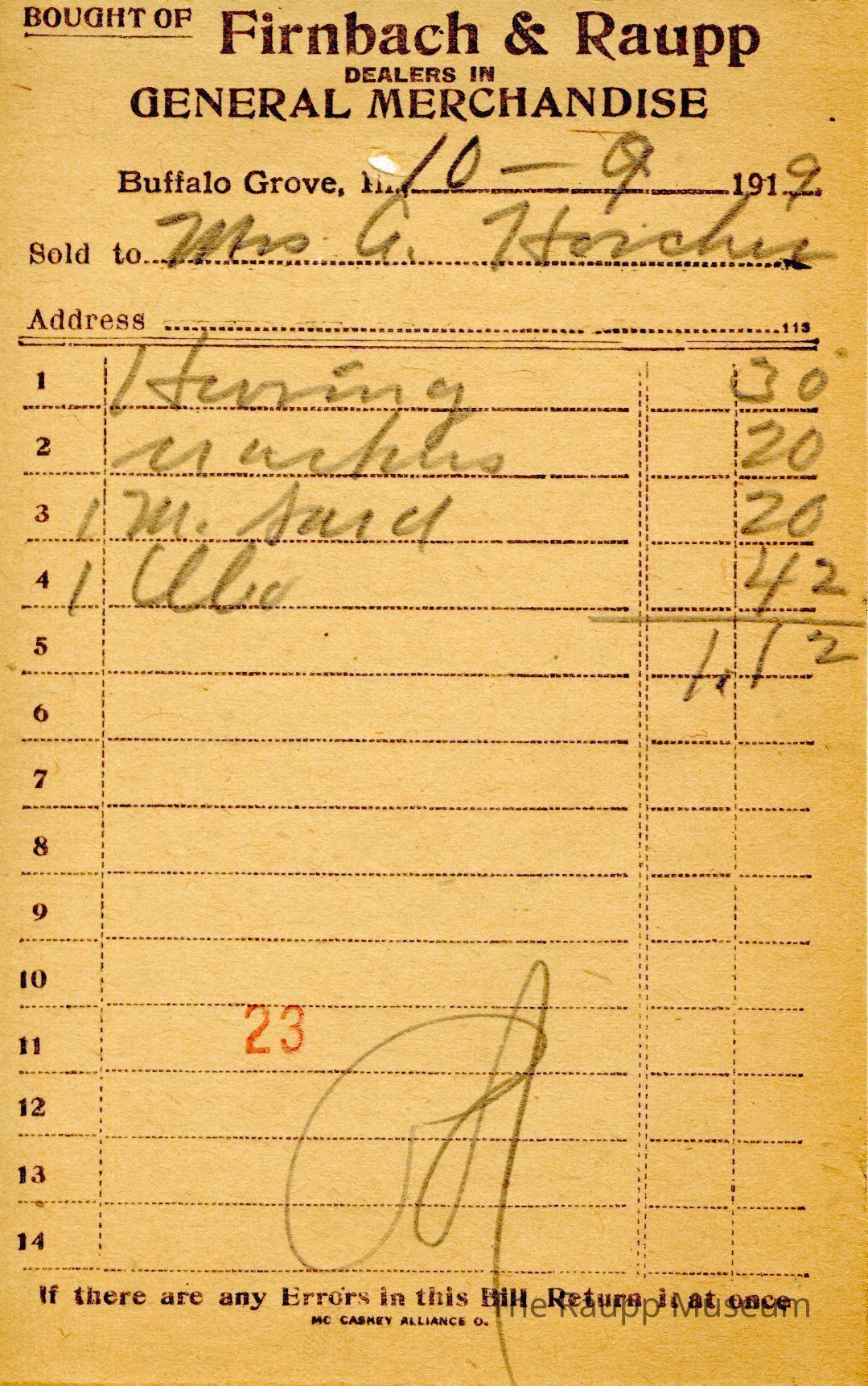 One (1) Firnbach and Raupp store receipt from October 9, 1919. Receipt is rectangular with black printed text and written notes in pencil. The receipt is for Mrs. G. Horcher, who bought herring for $0.30, crackers for $0.20, one M. sard for $0.20, and one oleo for $0.42. The bill total is $1.12 and the receipt is marked as paid. A red stamp of 23 is located towards the bottom of the page. The text from top to bottom is: BOUGHT OF Firnbach & Raupp; DEALERS IN GENERAL MERCHANDISE; Buffalo Grove, Ill.; Sold to; Address; If there are any Errors in this Bill Return It at once; MC CASKEY ALLIANCE O.Archive Details
