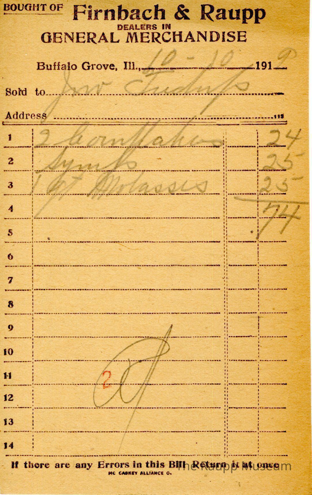 One (1) Firnbach and Raupp store receipt from October 10, 1919. Receipt is rectangular with black printed text and written notes in pencil. The receipt is for Jow Tudup (?), who bought two cornflakes for $0.24, syrup for $0.25, and one quart of molasses for $0.25. The bill total is $0.74 and the receipt is marked as paid. A red stamp of 2 is located towards the bottom of the page. The text from top to bottom is: BOUGHT OF Firnbach & Raupp; DEALERS IN GENERAL MERCHANDISE; Buffalo Grove, Ill.; Sold to; Address; If there are any Errors in this Bill Return It at once; MC CASKEY ALLIANCE O.Archive Details
