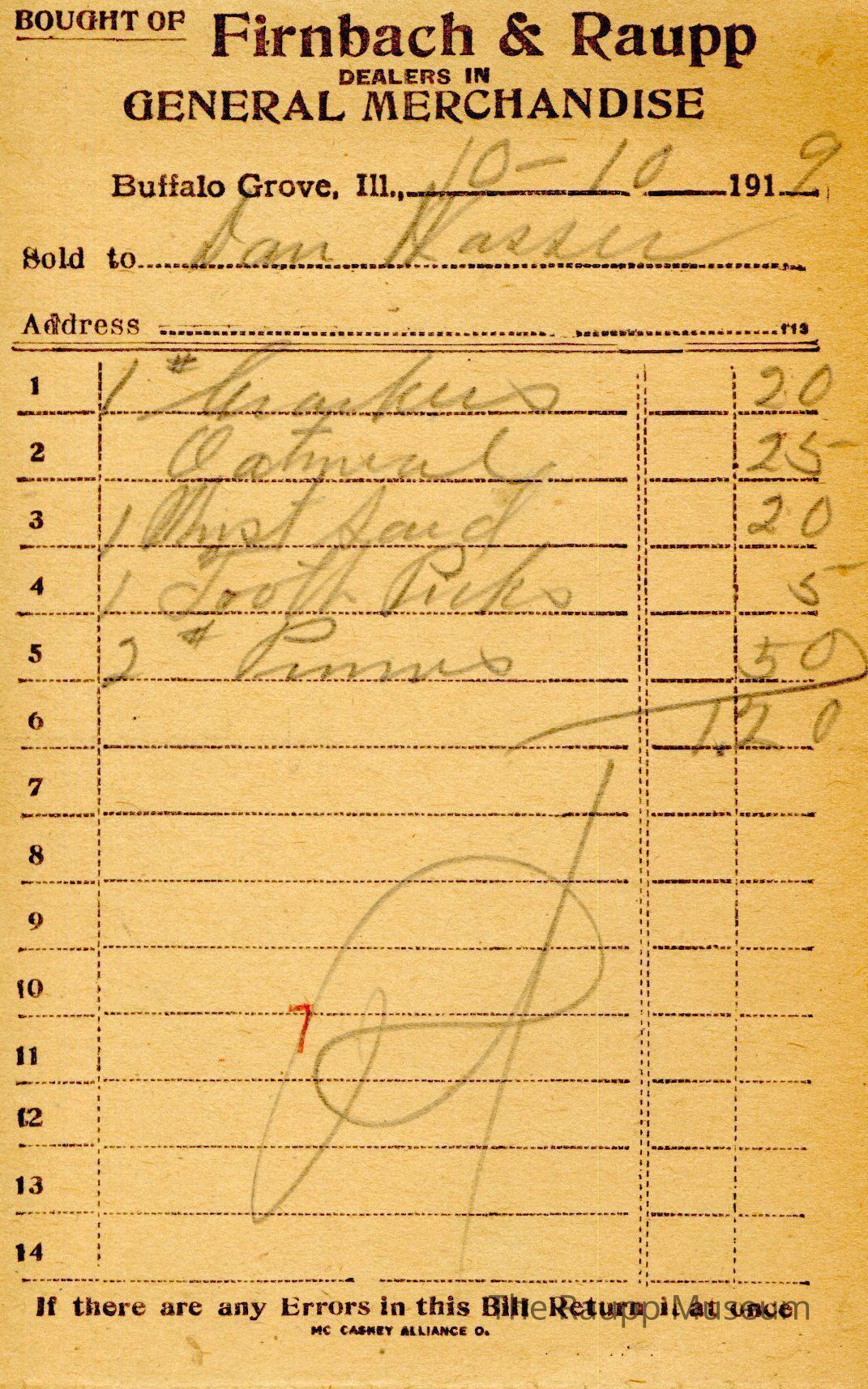 One (1) Firnbach and Raupp store receipt from October 10, 1919. Receipt is rectangular with black printed text and written notes in pencil. The receipt is for And. Hinsberger (?), who bought one pound of butter for $0.72 and two pounds of powdered sugar for $0.30. The bill total is $1.02 and the receipt is marked as paid. A red stamp of 6 is located towards the bottom of the page. The text from top to bottom is: BOUGHT OF Firnbach & Raupp; DEALERS IN GENERAL MERCHANDISE; Buffalo Grove, Ill.; Sold to; Address; If there are any Errors in this Bill Return It at once; MC CASKEY ALLIANCE O.Archive Details