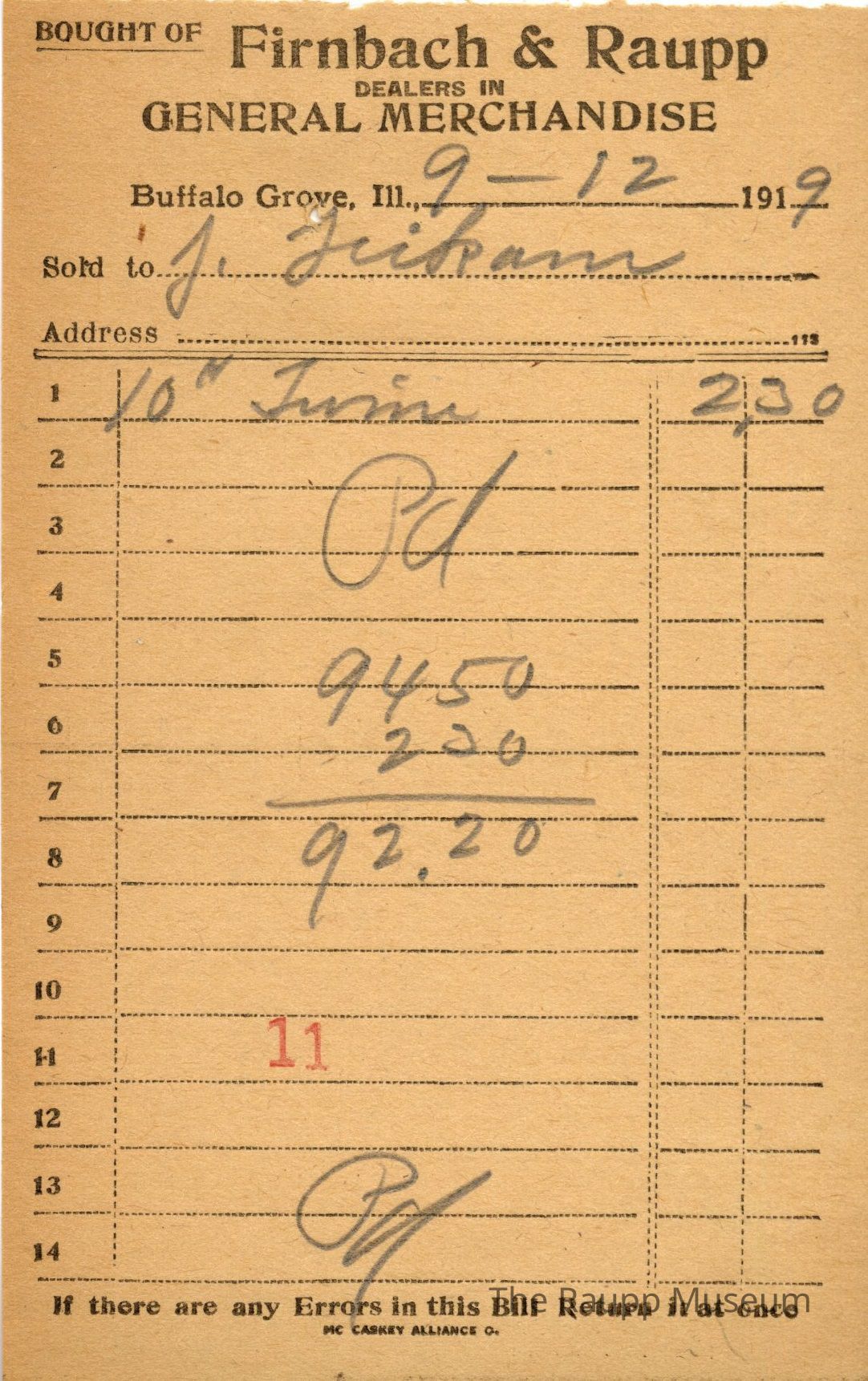 One (1) Firnbach and Raupp store receipt from September 12 1919. Receipt is for J. Leikam, and has one item purchased. Purchased item is ten (10) # twine. Total is $2.30. Receipt is rectangular, with both printed and handwritten text. On the top is printed "Firnbach & Raupp Dealers In General Merchandise." PD is handwritten on the bottom and top, and a red 11 is stamped center bottom. Math markings are on the center of the page, with a total of $92.20.Archive Details