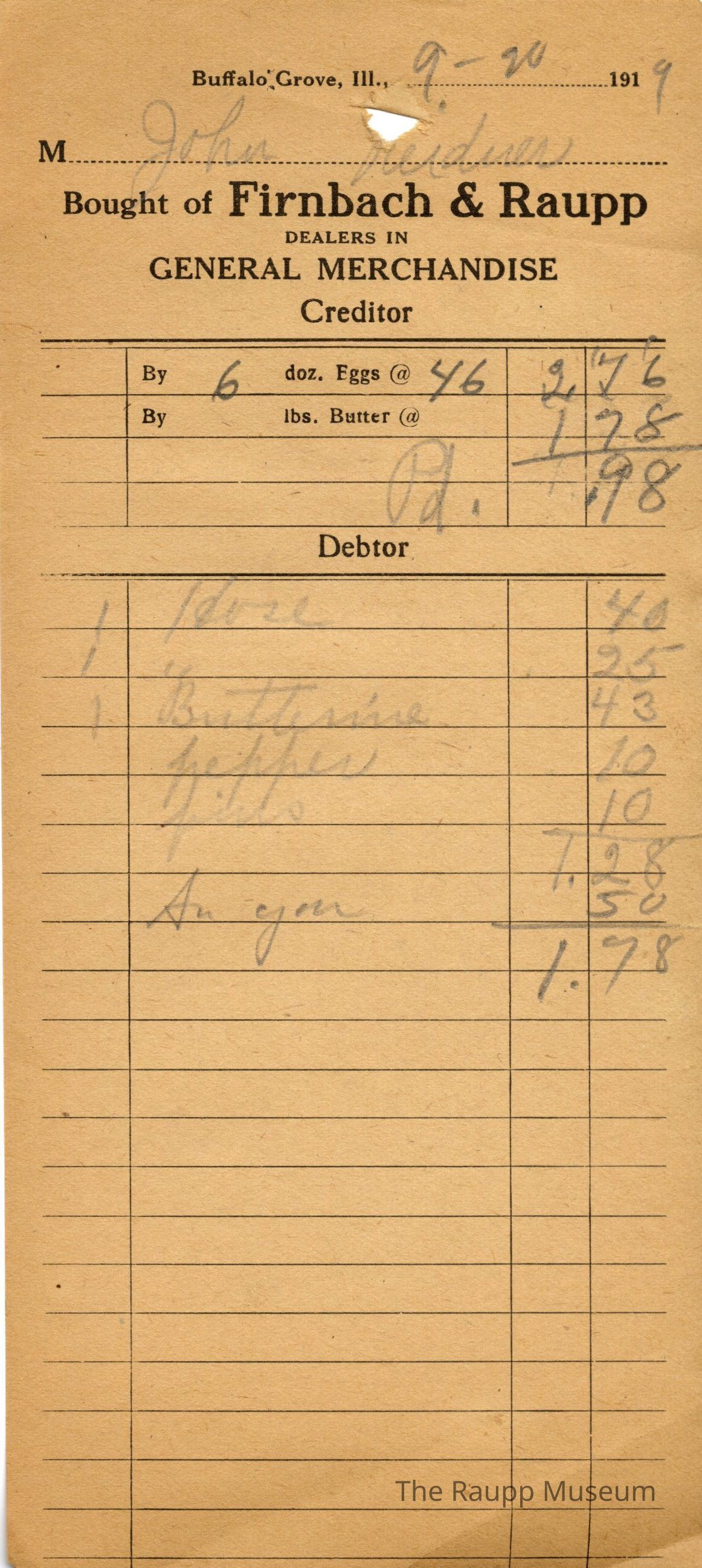One (1) Firnbach and Raupp store receipt from September 20 1919. Receipt is for John Weidner, and has five (5) items purchased, as well as six (6) dozen eggs given as credit at $.46 per dozen, totaling $2.76 in credit. Purchased items are one (1) (?), one (1) butterine, one (1) pepper, one (1) (?), and one (1) sugar. Total is $1.78. Receipt is rectangular, with both printed and handwritten text. On the top is printed "Firnbach & Raupp Dealers In General Merchandise." PD is handwritten on the top.Archive Details
