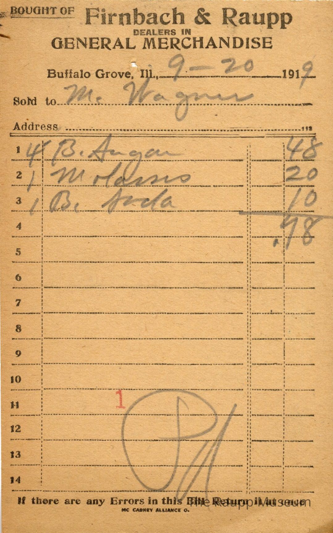 One (1) Firnbach and Raupp store receipt from September 20 1919. Receipt is for Mr. Wagner, and has three (3) items purchased. Purchased items are one (1) B. Sugar, one (1) molasses, and one (1) B. soda. Total is $.98. Receipt is rectangular, with both printed and handwritten text. On the top is printed "Firnbach & Raupp Dealers In General Merchandise." PD is handwritten on the bottom, and a red number 1 is stamped on the center bottom.Archive Details
