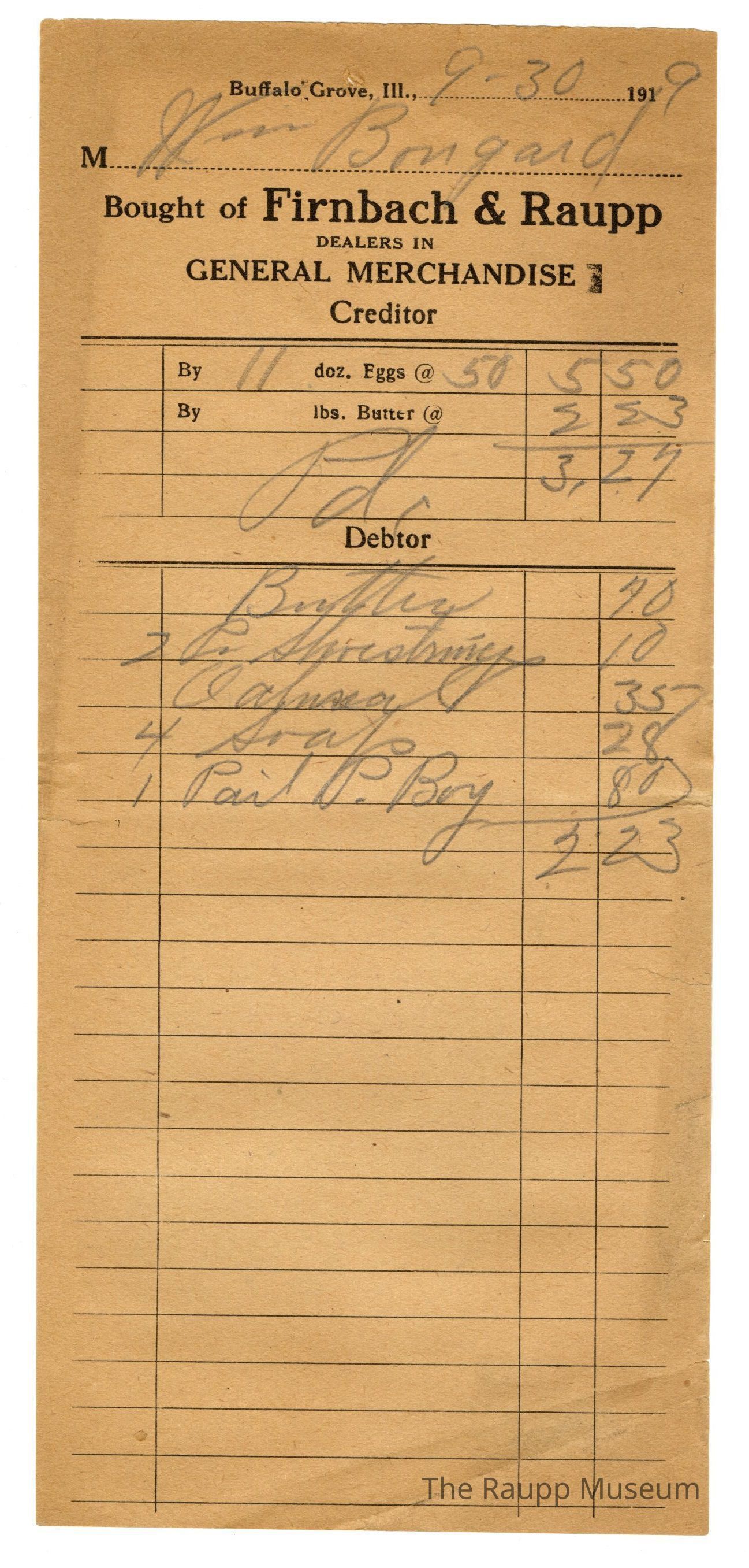 One (1) Firnbach and Raupp store receipt from 9/30/1919. Receipt recipient is Wm Bougard (William Bougard) and has five (5) items purchased (one butter, two (2) pair (written as Pr) shoe string, one (1) oatmeal, four (4) soap, and one (1) Paid P, Buy. Wm Bougard brought in elevan (11) dozen eggs at fifty (50) cents and recieved a five dollar and fifty cents ($5.50). Wm Bougard's bill paid two dollar and twenty three cents ($2.23) which was subtracted from his balance leaving him with three dollars and twenty seven cents ($3.27). Receipt is rectangular, has black ink and written in pencil. The top reads: Bougth of Firnbach & Raupp; DEALERS IN; GENERAL MERCHANDISE (printed in capital letters); Creditor; Debtor.Archive Details