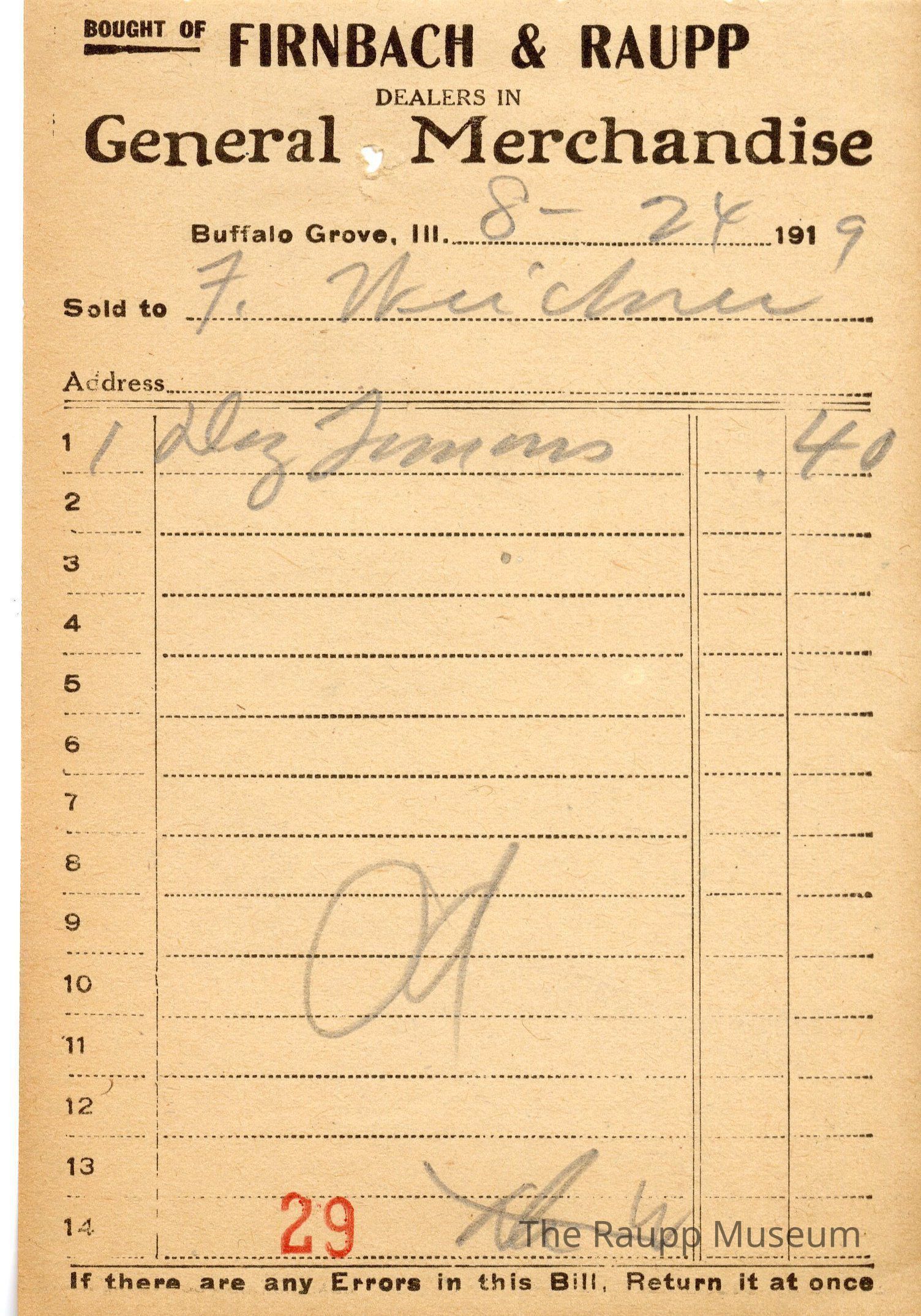 The black text is as follows, from top to bottom: Bought of Firnbach & Raupp; Dealers in GENERAL MERCHANDISE; Buffalo Grove, Ill.; Sold to; Address; If there are any Errors in this Bill Return it at once.Archive Details