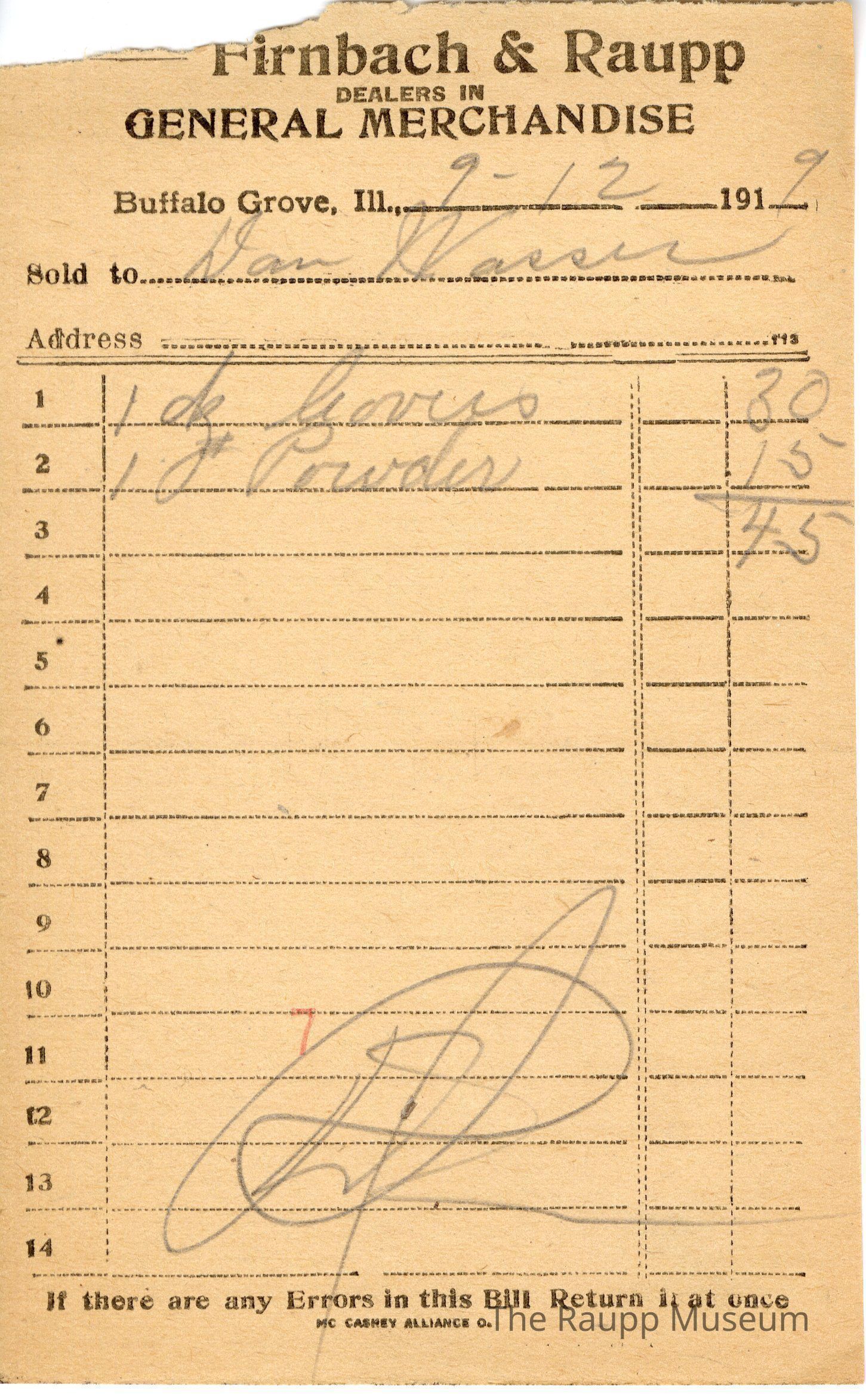 The black text is as follows, from top to bottom: Bought of Firnbach & Raupp; Dealers in GENERAL MERCHANDISE; Buffalo Grove, Ill.; Sold to; Address; If there are any Errors in this Bill Return it at once; MCCASKEY ALLIANCE O.Archive Details