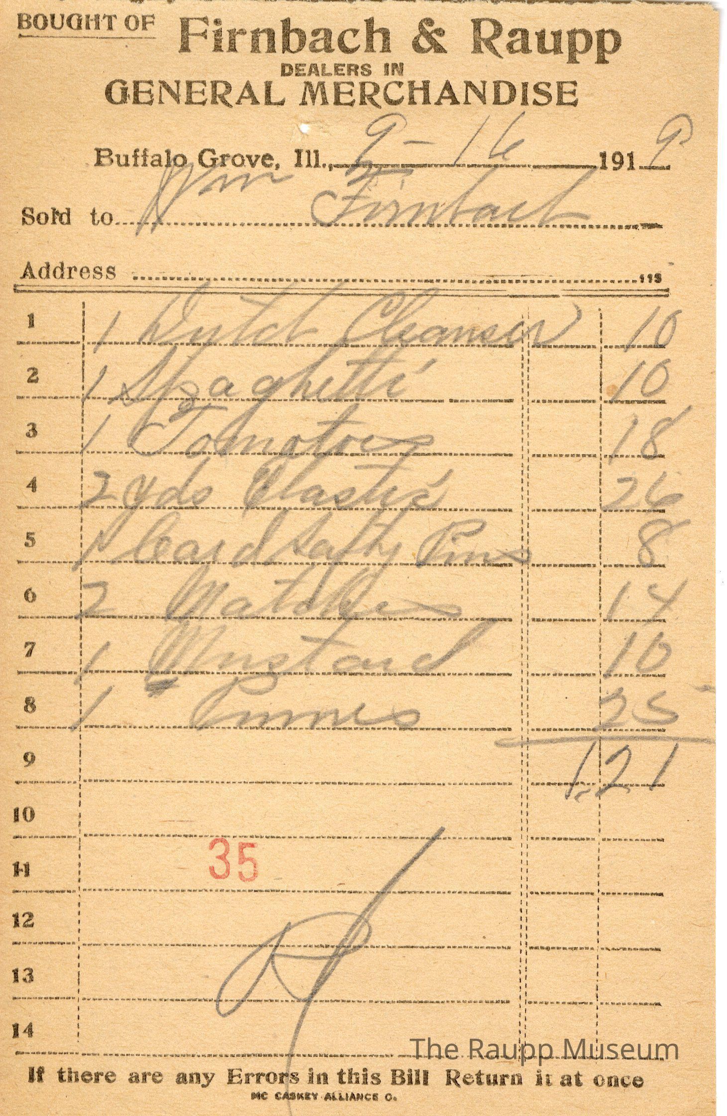 One (1) Firnbach and Raupp store receipt from September 16, 1919. Receipt is rectangular with black printed text and written notes in pencil. The receipt is for Wm. Firnbach, who bought one watch cleanser for $0.10, one spaghetti for $0.10, one tomatoes for $0.18, two yards of clastic (?) for $0.26, one bard safty pins (?) for $0.08, two matches for $0.14, one mustard fpr $0.10, and one pound of prunes for $0.25. Bill total is $1.21. There's a red stamp of 35 close to the bottom with the bill marked as paid.