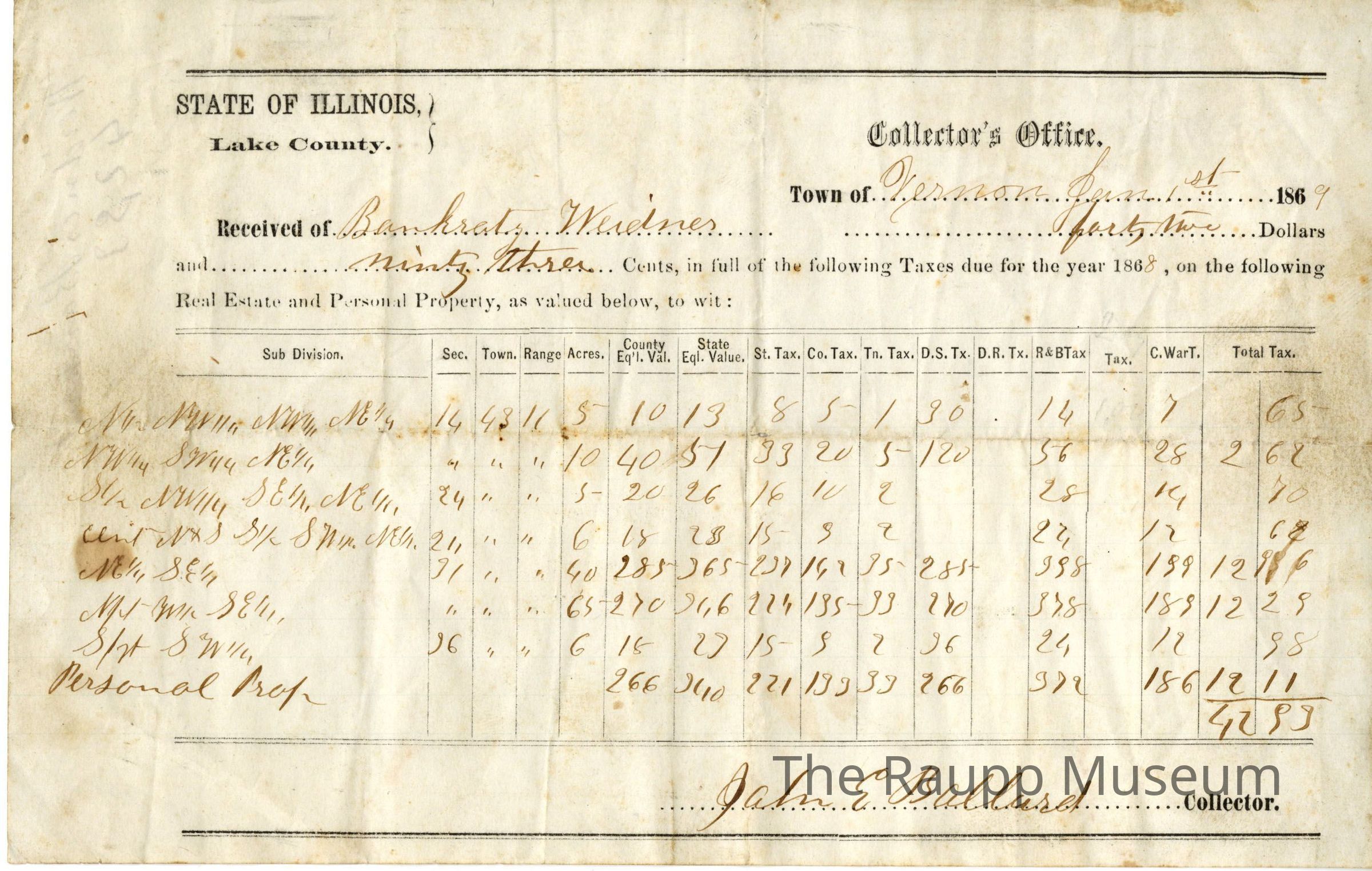 One (1) Property Taxes Receipt for Pankratz Weidner, 1869. The document has printed "State of Illinois, Lake County, Collector's Office" followed by a series of information filled into blank spaces. The total tax was $45.93. There are seven areas of land, and one line for Personal Property listed that were taxed. The handwritten portions are in brown text, and it is signed by John E. Ballard, Collector. This is for taxes due for 1868.Archive Details