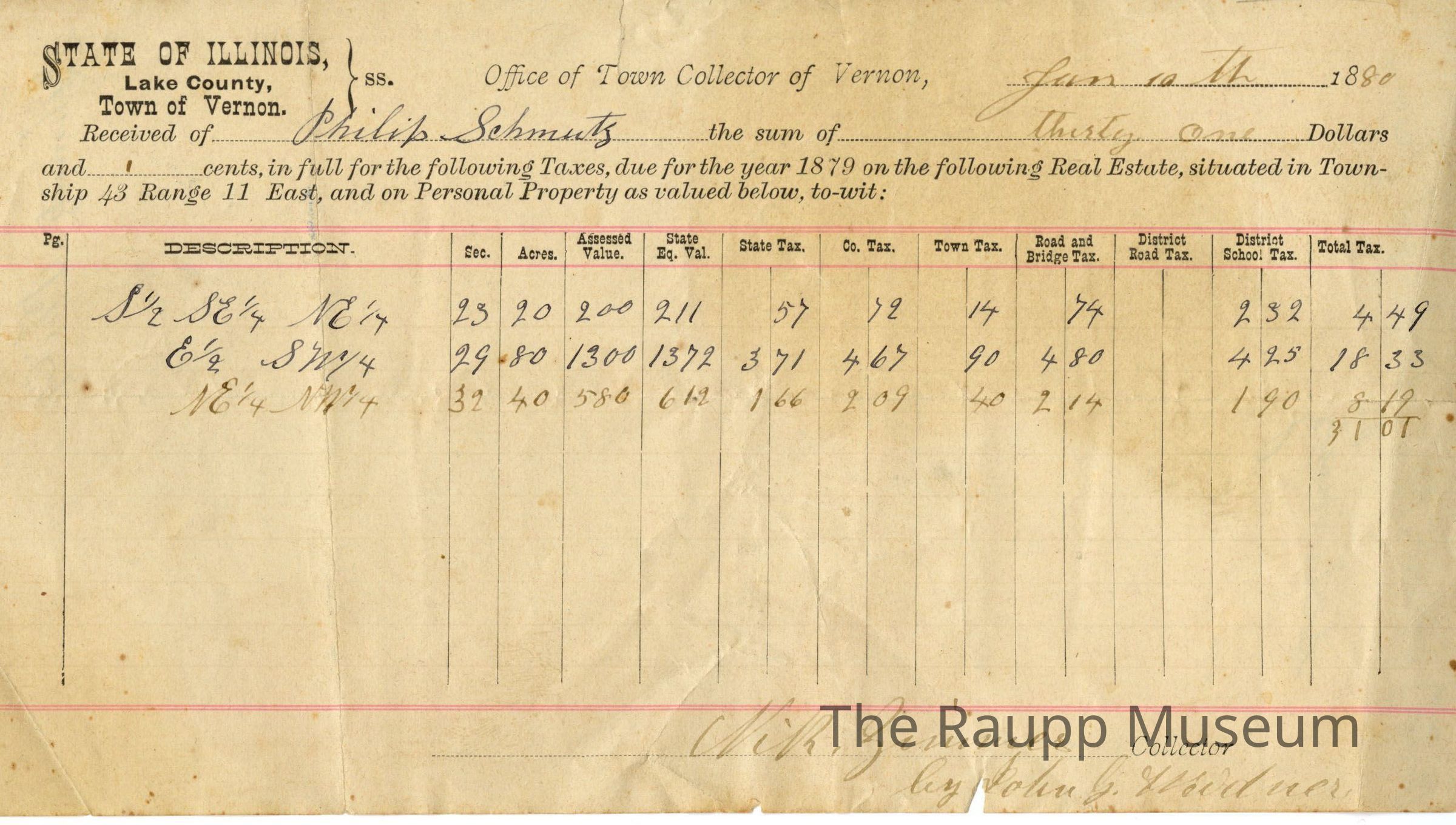 One (1) Property Taxes Receipt for Philip Schmutz, 1880. The document has printed "State of Illinois, Lake County, Town of Vernon" followed by a series of information filled into blank spaces. The total tax was $31.01. There are three land areas that were taxed. The handwritten portions are in brown and black text, and it is signed by Nik. Zimmer, Collector, with "by John G. Weidner" below. This is for taxes due for 1879.