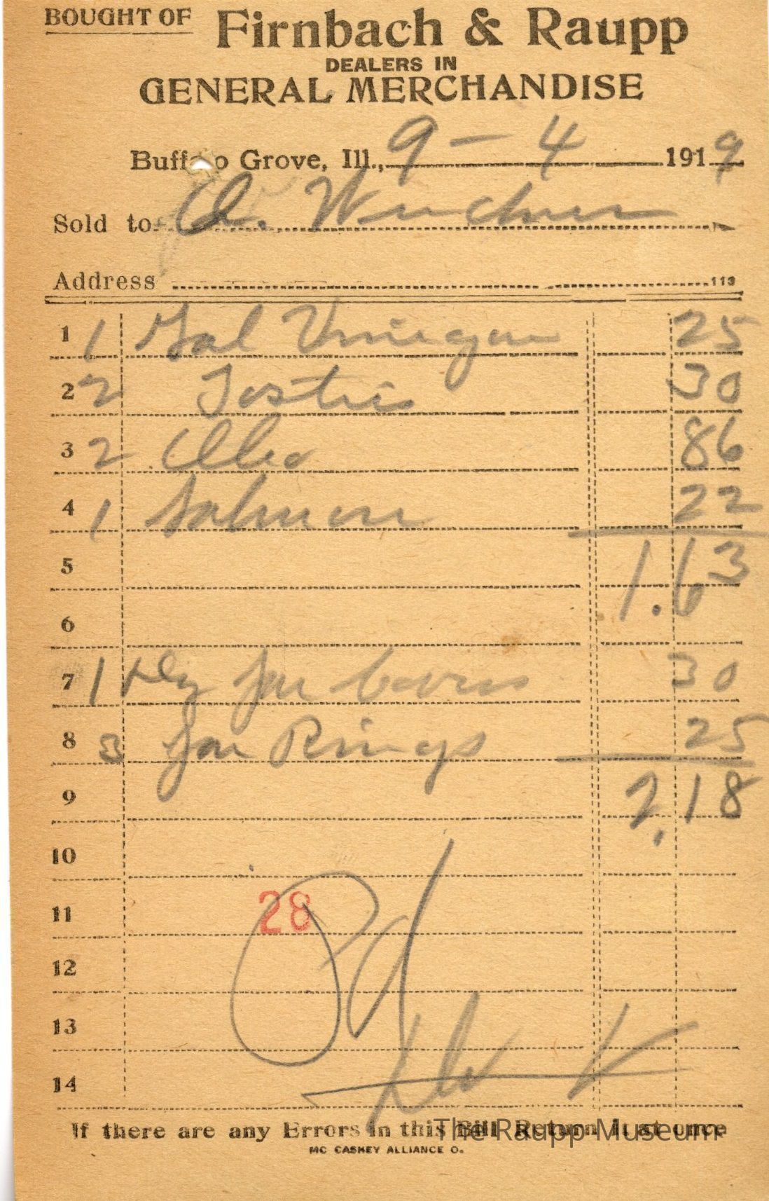 One (1) Firnbach and Raupp store receipt from September 4 1919. Receipt is for U Weidner, and has six (6) items purchased. Purchased items include one (1) gal vinegar, two (2) toasties, two (2) Oleo, one (1) (?), one (1) dz jar covers, three (3) jar rings. Total is $2.18. Receipt is rectangular, with both printed and handwritten text. On the top is printed "Firnbach & Raupp Dealers In General Merchandise." PD is handwritten on the bottom, with a red 28 stamped in the center bottom. Some crossed out scratch marks are handwritten on the bottom of the page.Archive Details
