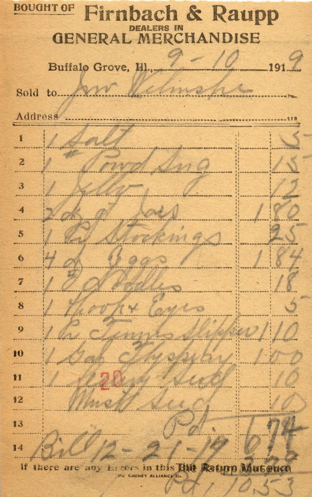 One (1) Firnbach and Raupp store receipt from September 10 1919. Receipt is for (?) Welinske, and has twelve (12) items purchased. Purchased items include one (1) salt, one (1) pound sugar, one (1) jello, two (2) dozen at lamp (?), one (1) pair stockings, four (4) dozen eggs, one (1) pound of noodles, one (1) hook + eyes, one (1) pair of tennis slippers, one (1) (?), one (1) (?), and one (1) (?). Total is $6.74. Receipt is rectangular, with both printed and handwritten text. On the top is printed "Firnbach & Raupp Dealers In General Merchandise." PD is handwritten on the bottom, with a red 20 stamped in the center bottom.A bill from December 21 1919 is also paid for a total of $10.53.Archive Details