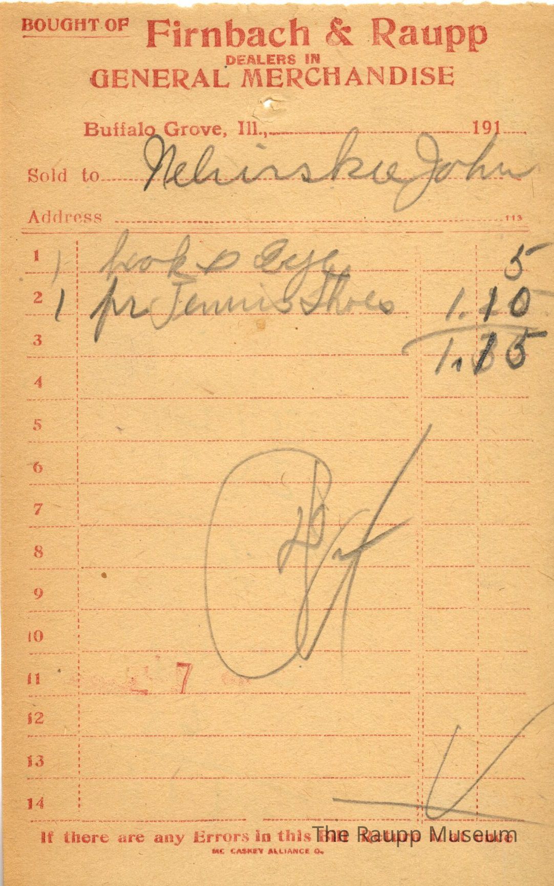 One (1) Firnbach and Raupp store receipt from circa 1919. Receipt is for Welinshe, John, and has two (2) items purchased. Purchased items include one (1) hook + eye, and one (1) pair tennis shoes. Total is $1.15. Receipt is rectangular, with both printed and handwritten text. On the top is printed "Firnbach & Raupp Dealers In General Merchandise." PD is handwritten on the bottom, with a red 7 stamped in the center bottom. Math markings are president on the center back.Archive Details