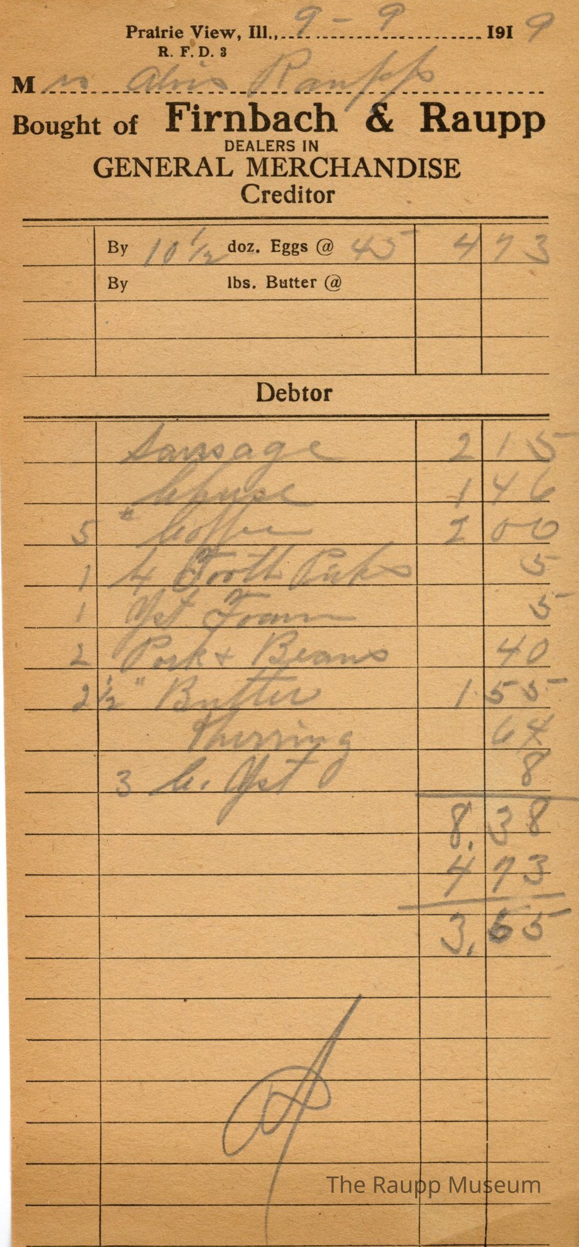 One (1) Firnbach and Raupp store receipt from September 9 1919. Receipt is for Mrs. Alois Raupp, and has nine (9) items purchased, as well as ten and a half (10 1/2) dozen eggs sold as credit for $.45 per dozen totaling $4.73. Purchased items include one (1) sausage, one (1) (?), five (5) # coffee, one (1) dozen tooth picks, one (1) yeast foam, two (2) pork + beans, two and a half (2 1/2) pound butter, one (1) herring, three (3) fillet. Total is $8.38, and $3.65 after credit. Receipt is rectangular, with both printed and handwritten text. On the top is printed "Firnbach & Raupp Dealers In General Merchandise." PD is handwritten on the bottom.Archive Details