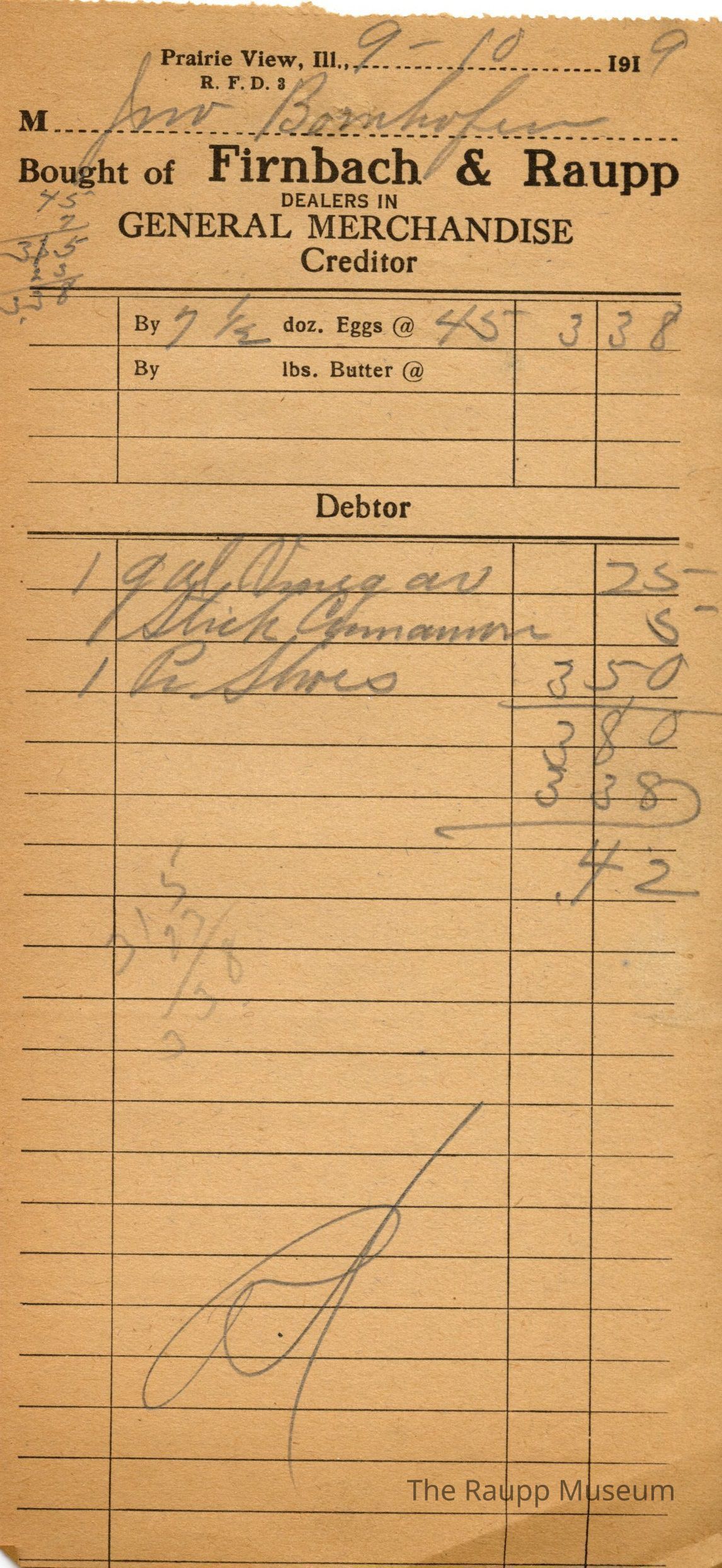 One (1) Firnbach and Raupp store receipt from September 10 1919. Receipt is S. Bornhofen, and has three (3) items purchased. Receipt also includes credit for seven and a half (7 1/2) dozen eggs at $.45 per dozen, totaling $3.38. Purchased items include one (1) gal vinegar, one (1) stick (?), and one (1) pair shoes. Total is $3.80 before credit, $.42 after credit. Receipt is rectangular, with both printed and handwritten text. On the top is printed "Firnbach & Raupp Dealers In General Merchandise." PD is handwritten on the bottom, and math markings are evident on the top left and center left of the receipt.Archive Details