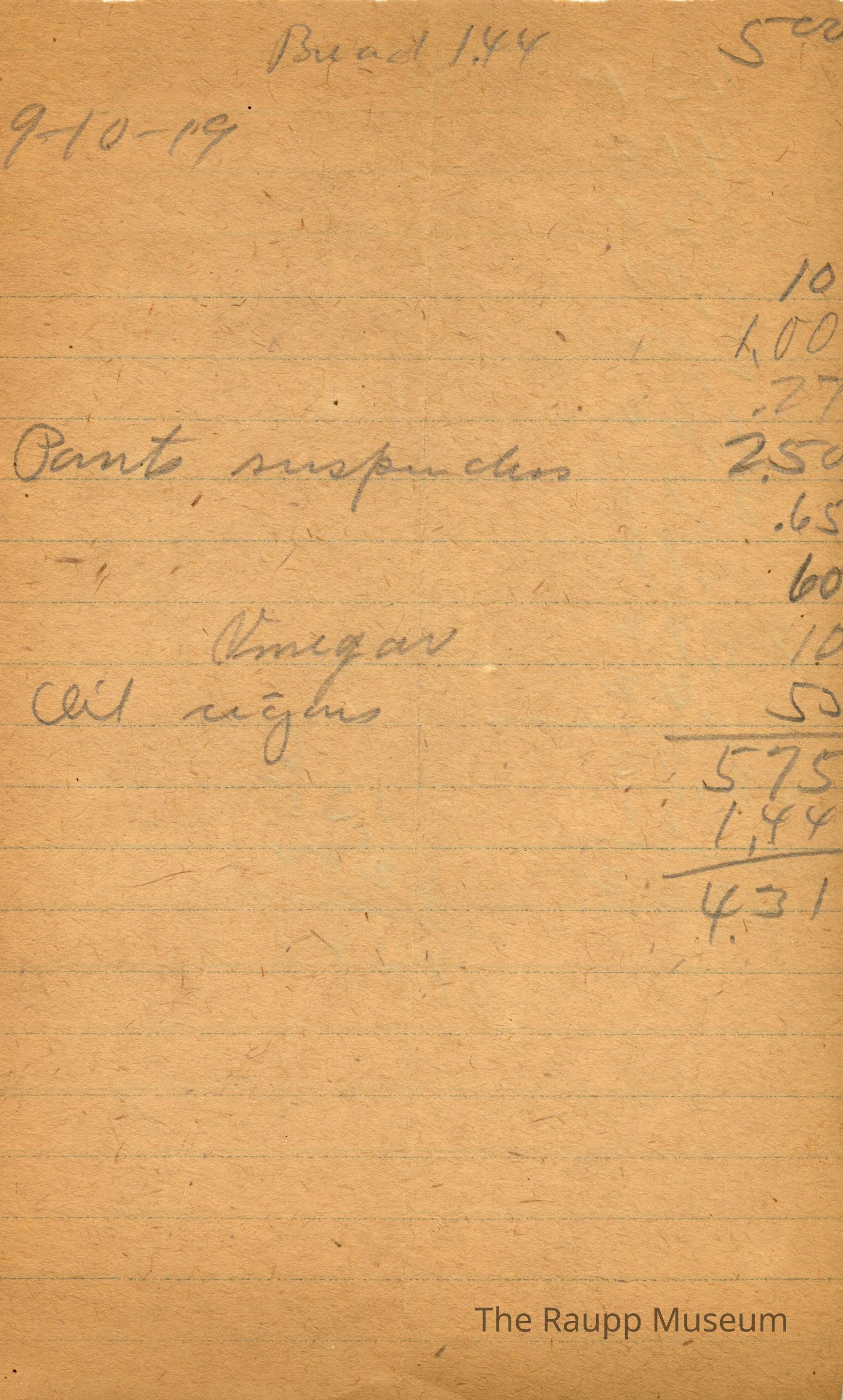 One (1) Firnbach and Raupp store receipt from September 10 1919. Receipt is an unnamed customer, and has five (5) items purchased. Purchased items include one (1) pants, one (1) suspenders, one (1) vinegar, one (1) coil, and sugars. Total is $4.31 on the front. Receipt is rectangular, with only handwritten text. Math markings are evident in large print on both sides, and "Bread 1.44" is written at the top of the front.Archive Details