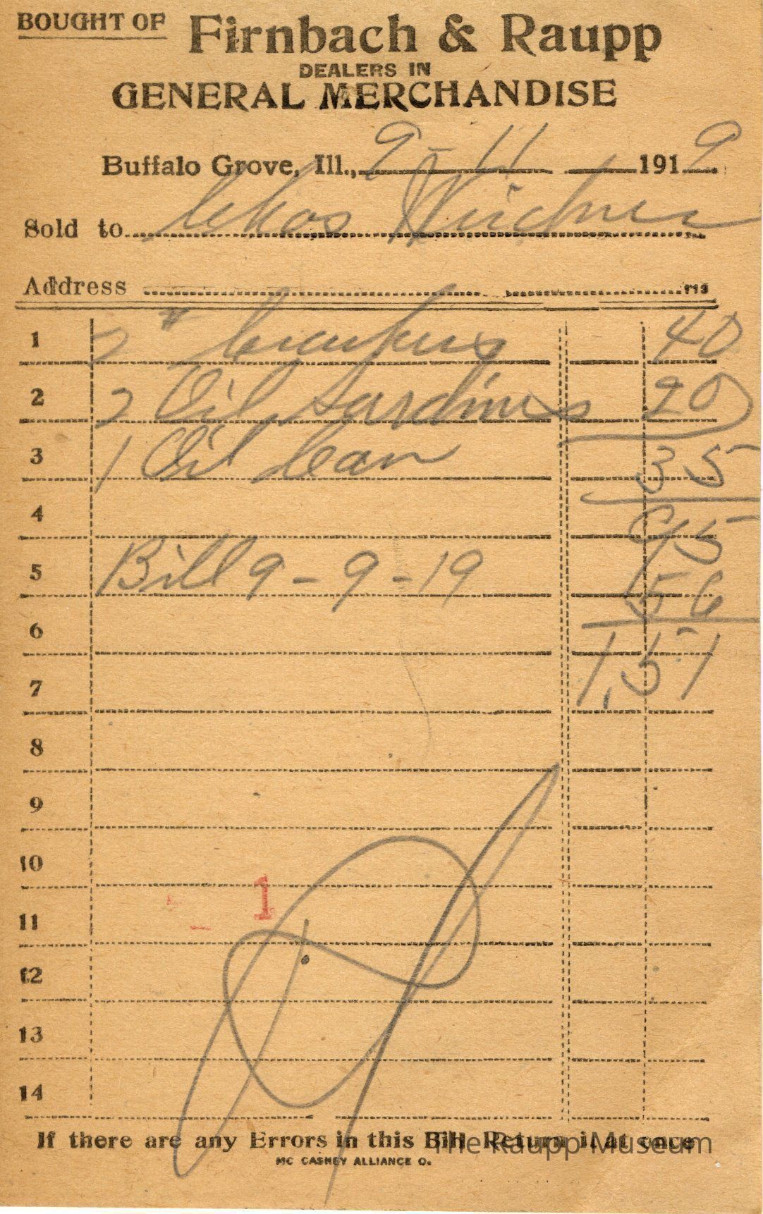 One (1) Firnbach and Raupp store receipt from September 11 1919. Receipt is for C. Weidner, and has three (3) items purchased. Purchased items include two (2) # (?), two (2) oil sardines, one (1) oil lean (?), and a bill paid from September 9th. Total is $1.51. Receipt is rectangular, with both printed and handwritten text. On the top is printed "Firnbach & Raupp Dealers In General Merchandise." PD is handwritten on the bottom, and a red 1 is stamped on the center bottom.Archive Details