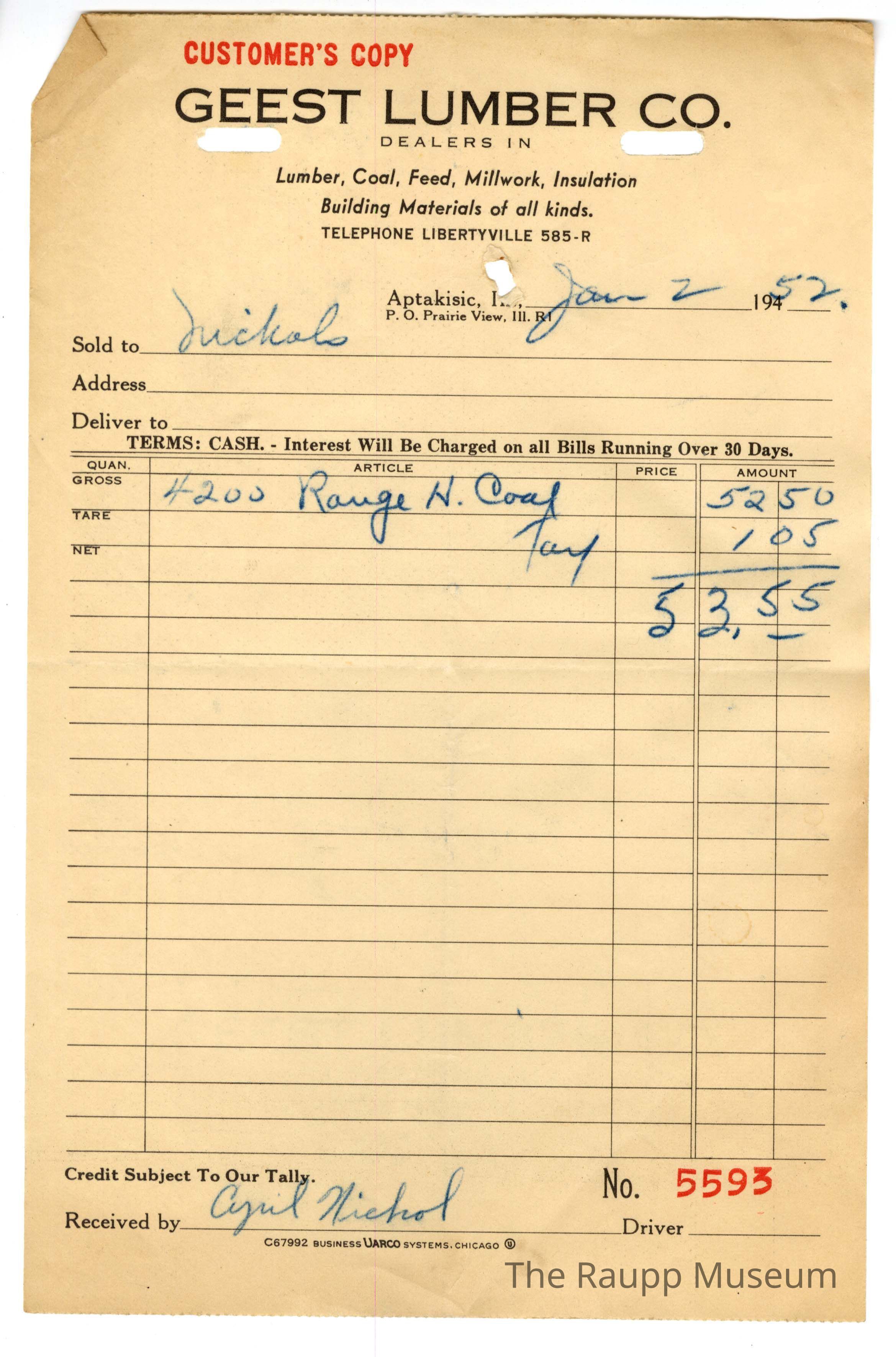 One (1) brown rectangular receipt from Geest Lumber Co. for Nickols on January 2, 1952. Receipt is for a 4200 Range H. Coal ($52.50) for a grand total of $53.55 after tax. Receipt has preprinted portions and handwritten portions in blue ink. The top is labeled "customer's copy" in red.