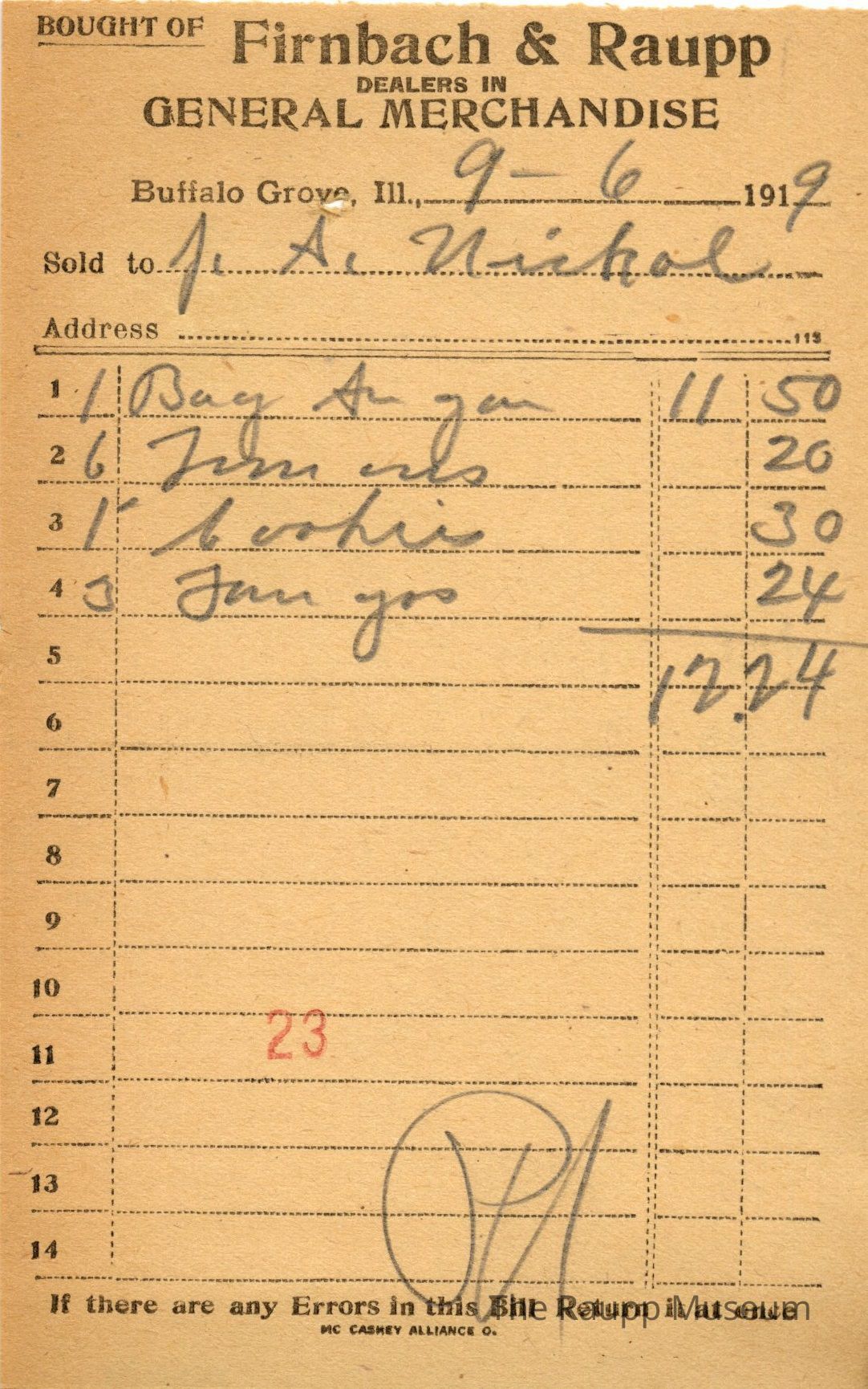 One (1) Firnbach and Raupp store receipt from September 6, 1919. Receipt is for L. A. Nickol, and has 4 items purchased. Purchased items included one (1) bag of sugar (for $11.50), six (6) lemons, one (1) cookies, and three (3) jam goo (?).The total was $12.24. Receipt is rectangular, with both pre-printed and hand written text in pencil. Handwritten PD on the bottom, with red 23 stamped on center bottom. Printed on the top is "Bought of Firnbach & Raupp Dealers in General Merchandise".Archive Details