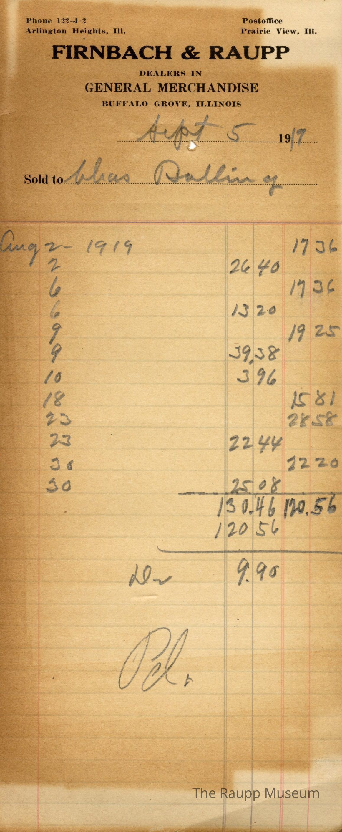 One (1) Firnbach and Raupp store receipt from September 5, 1919. Receipt is for Chas Balling, and has a list of store credit and their tab since Aug 2, 1919. Purchased items totaled to $130.46, and amount paid totals to $120.56, leaving a tab of $9.90. Receipt is rectangular, with both pre-printed and hand written text in pencil. Handwritten PD on the bottom. Printed on the top is "Bought of Firnbach & Raupp Dealers in General Merchandise".Archive Details