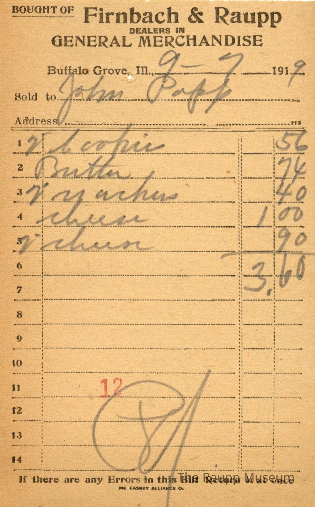 One (1) Firnbach and Raupp store receipt from September 7 1919. Receipt is for John Popp, and has 5 items purchased. Items purchased include two (2) cookies, one (1) butter, two (2) machers (?), one (1) cheese for $1.00, and two (2) cheese for $.90. Total was $3.60. Receipt is rectangular, with both pre-printed and handwritten text, and a red 12 is stamped on the center bottom. On the top is printed "Firnbach & Raupp Dealers In General Merchandise." PD is handwritten on the bottom.Archive Details