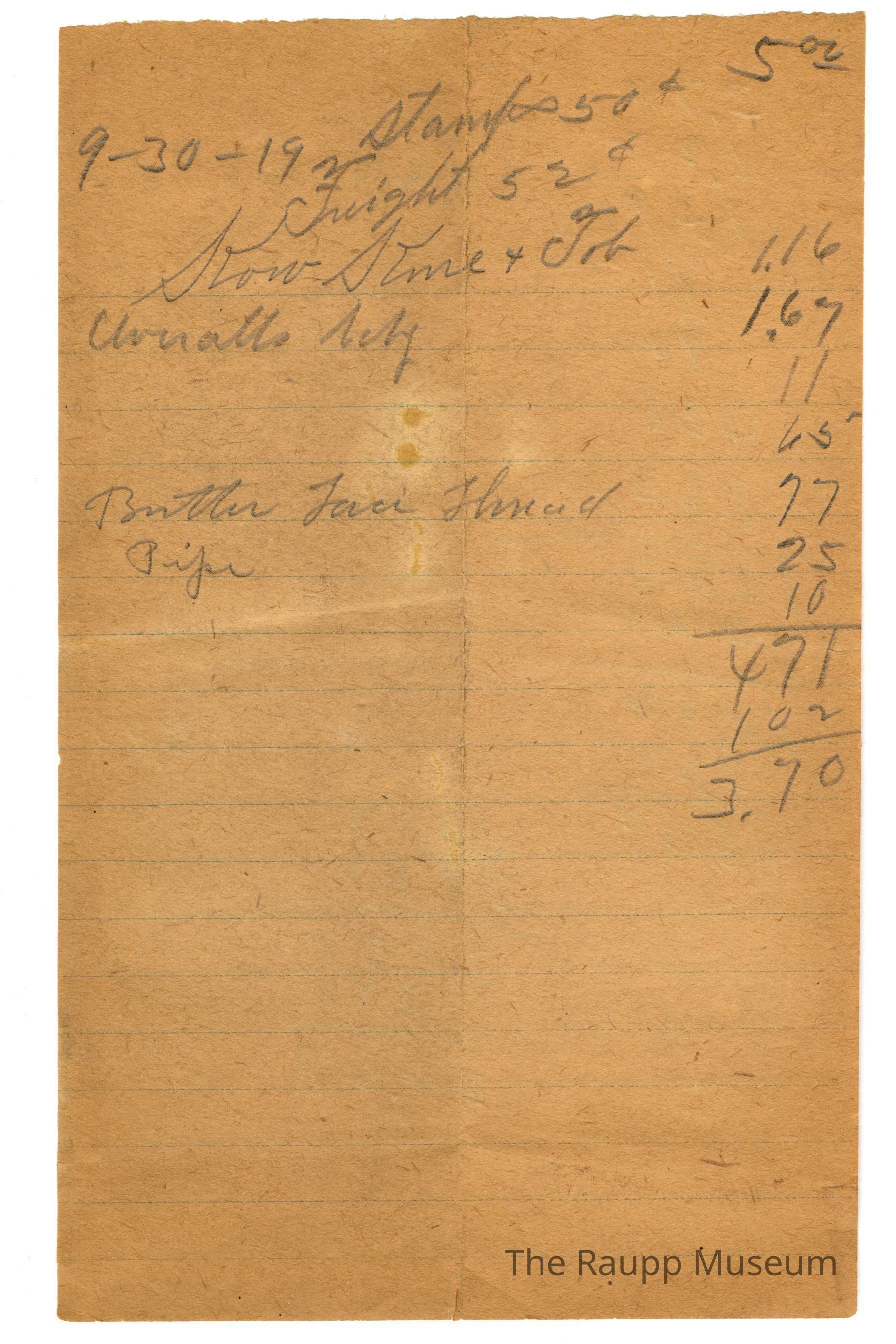 One (1) Firnbach and Raupp store receipt from 9/30/1919. Receipt recipient is unknown and has nine (9) items purchased (one (1) stamps, one (1) Freight, one (1) unknown job, one (1) overalls, empty (item not lisited), empty (item not listed), butter ? thread (listed in that order) and one (1) pipe. Unknown paid three dollars and seventy cents ($3.70). The number five (5) with the subscript of two underlined zeros (00) are written in the top right corner of the receipt. On the back of the recepit there are two (2) math equations and two (2) decimal numbers written in peincil. Receipt is rectangular, has blue ink and written in pencil.Archive Details