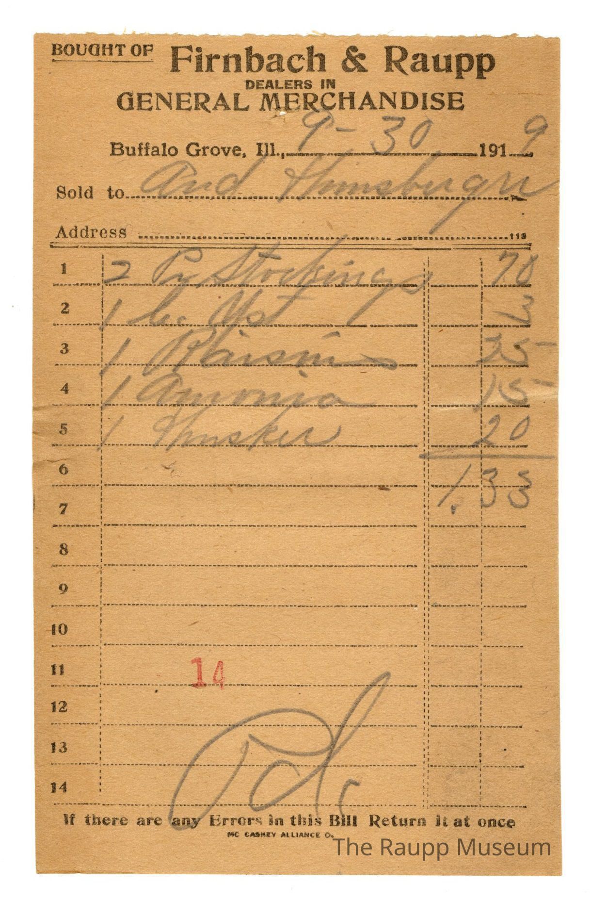 One (1) Firnbach and Raupp store receipt from 9/30/1919. Receipt recipient is And Hinsberger (Andrew Hisnberger) and has five (5) items purchased (two (2) pairs (written as Pr) stockings, one (1)pound (witten as lb) yeast (witten as yst), one (1) raisins, one (1) amonia, and one (1) cash. And Hindsberger paid one dollar and thirty three cents ($1.33). The letters Pd. (an abbreviation for paid) are written in the center of the receipt. Receipt is rectangular, has black ink and written in pencil. The top reads: BOUGHT OF (underlined and printed in capital letters); Firnbach & Raupp; DEALERS IN; GENERAL MERCHANDISE (printed in capital letters); Buffalo Grove Ill; Sold to; Address. The bottom reads: If there are any Errors in this Bill Return it at once; MC CASKEY ALLIANCE O. (printed in capital letters). The number fourteen (stamped as 14) is stamped in red ink at the bottom center of the page.Archive Details
