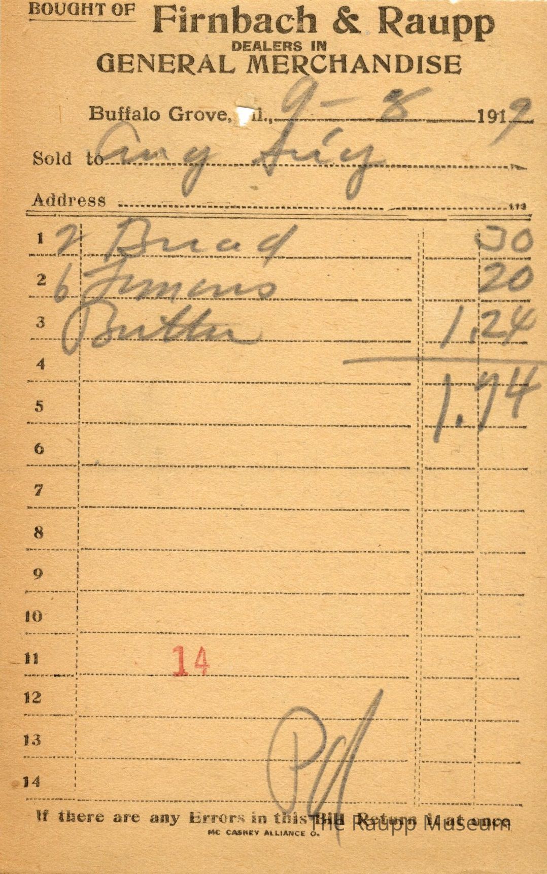 One (1) Firnbach and Raupp store receipt from September 8 1919. Receipt is for Greg Sieg, and has 3 items purchased. Items purchased include two (2) bread, six (6) (?), and one (1) butter. Total is $1.94. Receipt is rectangular, with both printed and handwritten text. On the top is printed "Firnbach & Raupp Dealers In General Merchandise." PD is handwritten on the bottom, and a red 14 is stamped on the center bottom.Archive Details