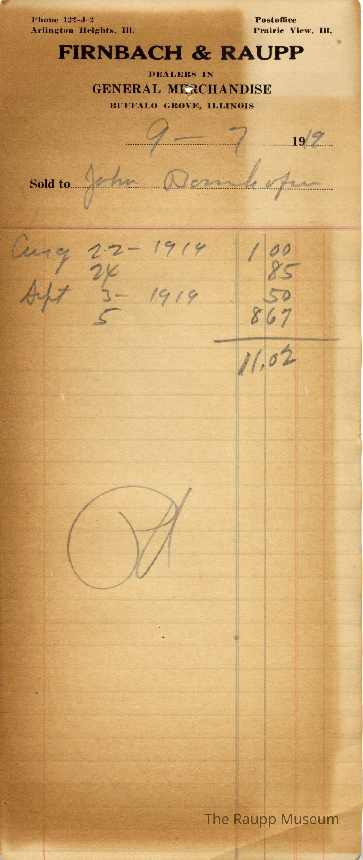 One (1) Firnbach and Raupp store receipt from September 7 1919. Receipt is for John Bamhotee (?), and is paying a previous tab. Tab includes purchases from Aug 22, 24 and Sept 3, 5. Total was $11.02. Receipt is rectangular, with both pre-printed and handwritten text. On the top is printed "Firnbach & Raupp Dealers In General Merchandise." PD is handwritten on the bottom.Archive Details