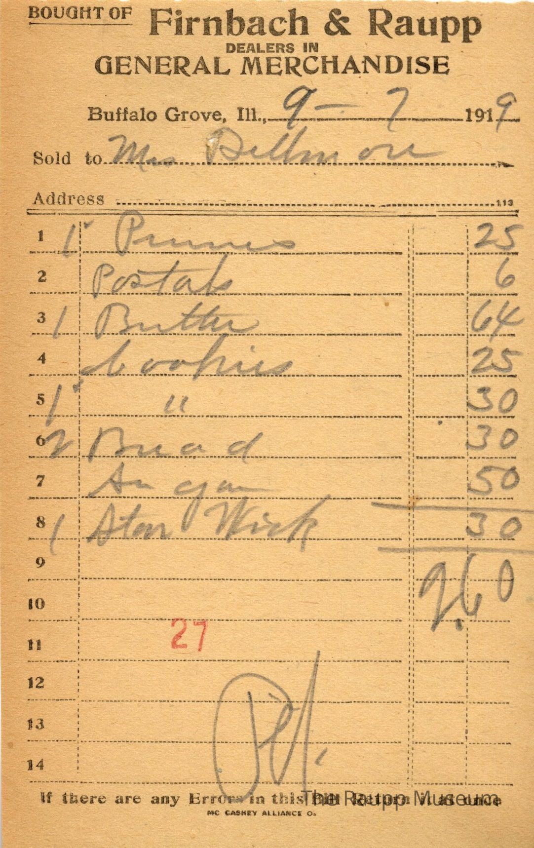 One (1) Firnbach and Raupp store receipt from September 7 1919. Receipt is for Mrs. Pellman, and has eight items purchased. Purchased items include one (1) (?), one (1) postals, one (1) butter, one (1) cookies, one (1) ", two (2) bread, one (1) sugar, one (1) Star Wick. Total was 2.60. Receipt is rectangular, with both pre-printed and handwritten text. On the top is printed "Firnbach & Raupp Dealers In General Merchandise." PD is handwritten on the bottom, and a red 27 is stamped in the center bottom.Archive Details