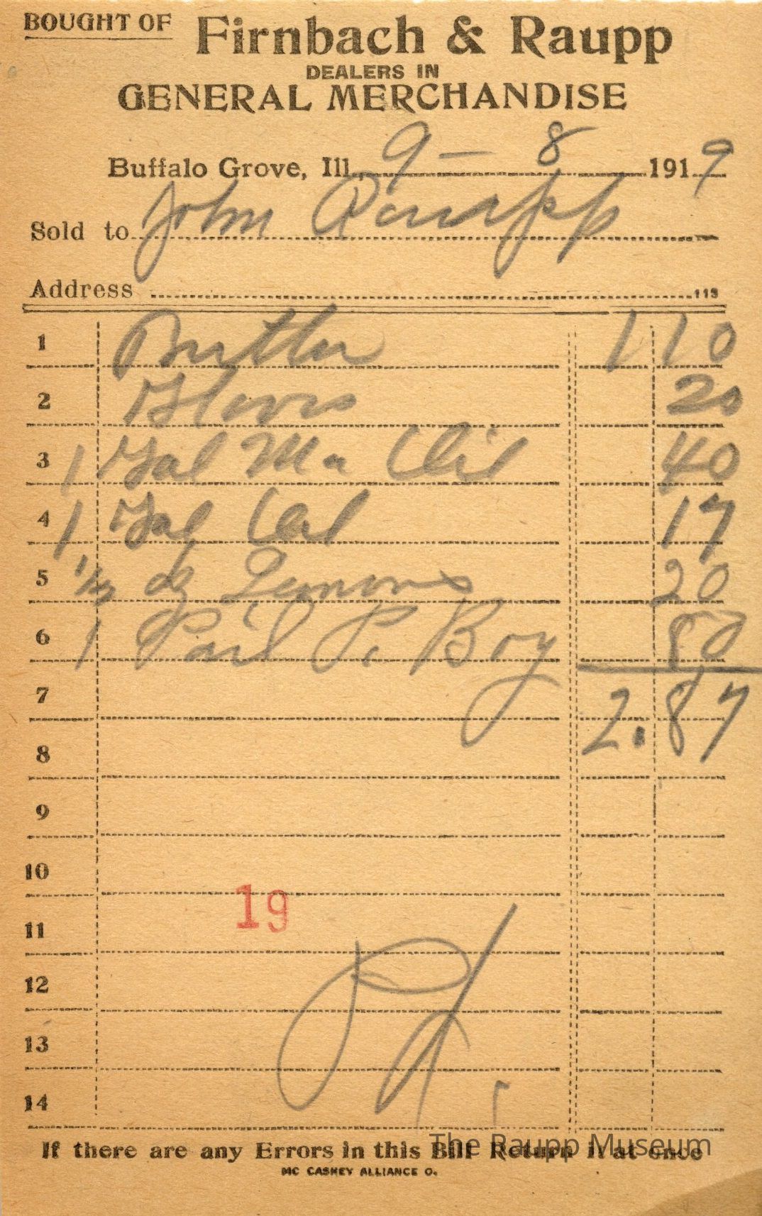 One (1) Firnbach and Raupp store receipt from September 8 1919. Receipt is for John Raupp, and has 6 items purchased. Items purchased include one (1) butter, one (1) gloves, one (1) gal (?), one (1) gal (?), one half (1/2) dz lemons, and one (1) Pail P. Boy (?). Total is $2.89. Receipt is rectangular, with both printed and handwritten text. On the top is printed "Firnbach & Raupp Dealers In General Merchandise." PD is handwritten on the bottom, and a red 19 is stamped on the center bottom.Archive Details