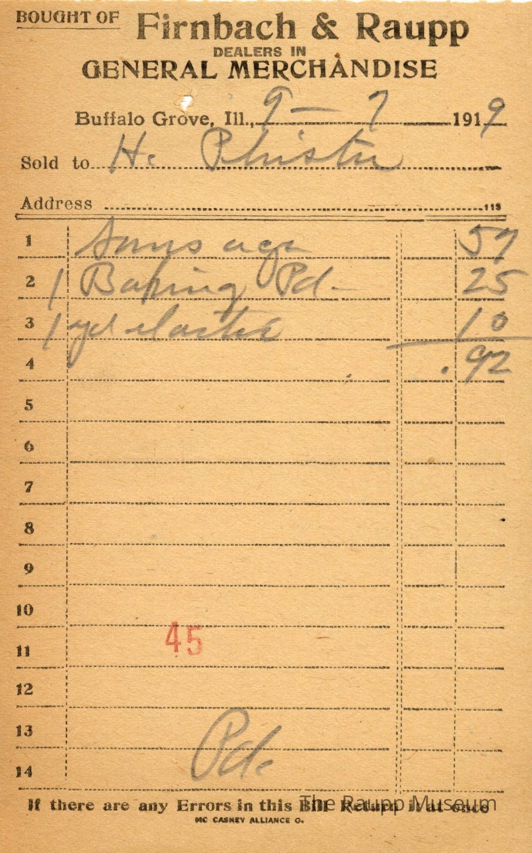One (1) Firnbach and Raupp store receipt from September 7 1919. Receipt is for He Phista, and has 3 items purchased. Items purchased include one (1) (?), one (1) baking pd, one (1) (?). Total was $.92. Receipt is rectangular, with both pre-printed and handwritten text, and a red 45 is stamped on the center bottom. On the top is printed "Firnbach & Raupp Dealers In General Merchandise." PD is handwritten on the bottom.Archive Details