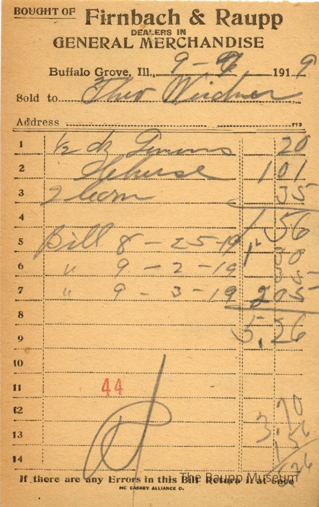 One (1) Firnbach and Raupp store receipt from September 7 1919. Receipt is for Theo Weidner, and has 3 items purchased. Items purchased include one half (1/2) doz lemons, one (1) cheese, two (2) (?). Total was $1.56, and bills from 8/25, 9/2, and 9/3 were added on for a total of $5.26. Receipt is rectangular, with both pre-printed and handwritten text, and a red 44 is stamped on the center bottom. On the top is printed "Firnbach & Raupp Dealers In General Merchandise." PD is handwritten on the bottom, along with some math markings. Date is crossed out and written over.Archive Details
