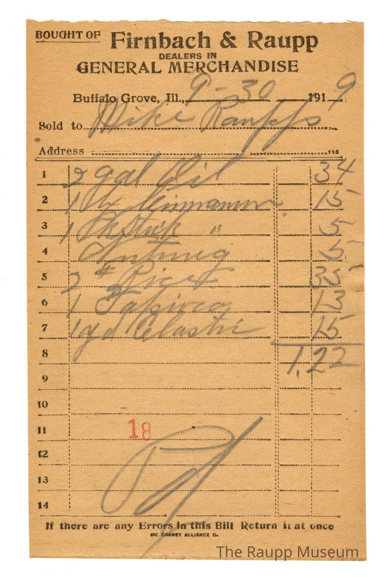 One (1) Firnbach and Raupp store receipt from 9/30/1919. Receipt recipient is Mike Raupp (Michael Raupp) and has seven (7) items purchased (two (2) gallons (written as gal) oil, one (1) possibly box (possibly wriiten as bx) cinnamon, one (1) pack (written as Pk) stick, one (1) nutmeg, two (2) pound (written as #) rice, one (1) tapioca, and one (1) yard (written as yd) elastic). Wm Firmbach paid one dollar and twenty two cents ($1.22). The letters Pd. (an abbreviation for paid) are written in the bottom center of the receipt. Receipt is rectangular, has black ink and is written in pencil. The top reads: BOUGHT OF (underlined and printed in capital letters); Firnbach & Raupp; DEALERS IN; GENERAL MERCHANDISE (printed in capital letters); Buffalo Grove Ill; Sold to; Address. The bottom reads: If there are any Errors in this Bill Return it at once, MC CASKEY ALLIANCE O. (printed in capital letters). The number eighteen (stamped as 18) is stamped in red ink at the bottom center of the page.Archive Details